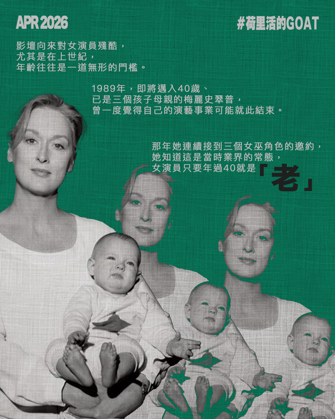 影壇向來對女演員殘酷,尤其是在上世紀,年齡往往是一道無形的門檻。1989年,即將邁入40歲、已是三個孩子母親的梅麗史翠普,曾一度覺得自己的演藝事業可能就此結束。那年她連續接到三個女巫角色的邀約,她知道這是當時業界的常態,女演員只要年過40就是「老」。