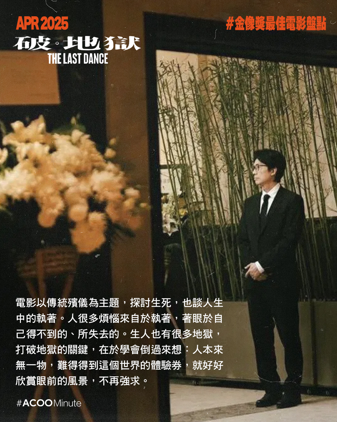 去年年尾上映的《破·地獄》再創港產片高峰,打破票房紀錄。電影以傳統殯儀為主題,探討生死,也談人生中的執著。人很多煩惱來自於執著,著眼於自己得不到的、所失去的。生人也有很多地獄,打破地獄的關鍵,在於學會倒過來想:人本來無一物,難得得到這個世界的體驗券,就好好欣賞眼前的風景,不再強求。
