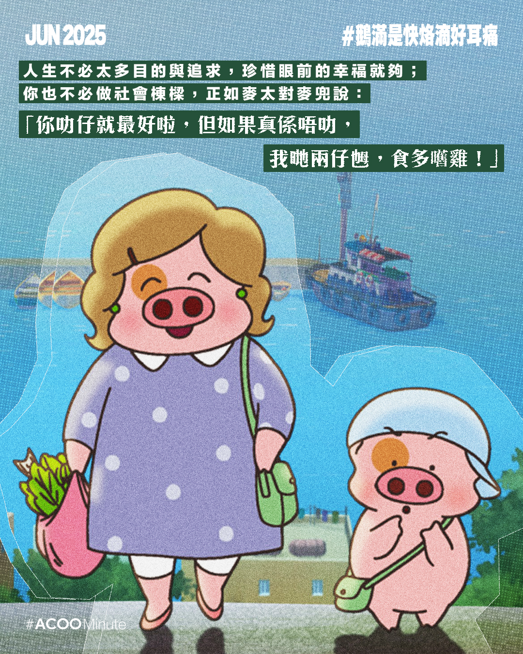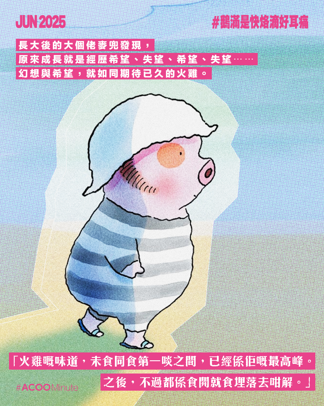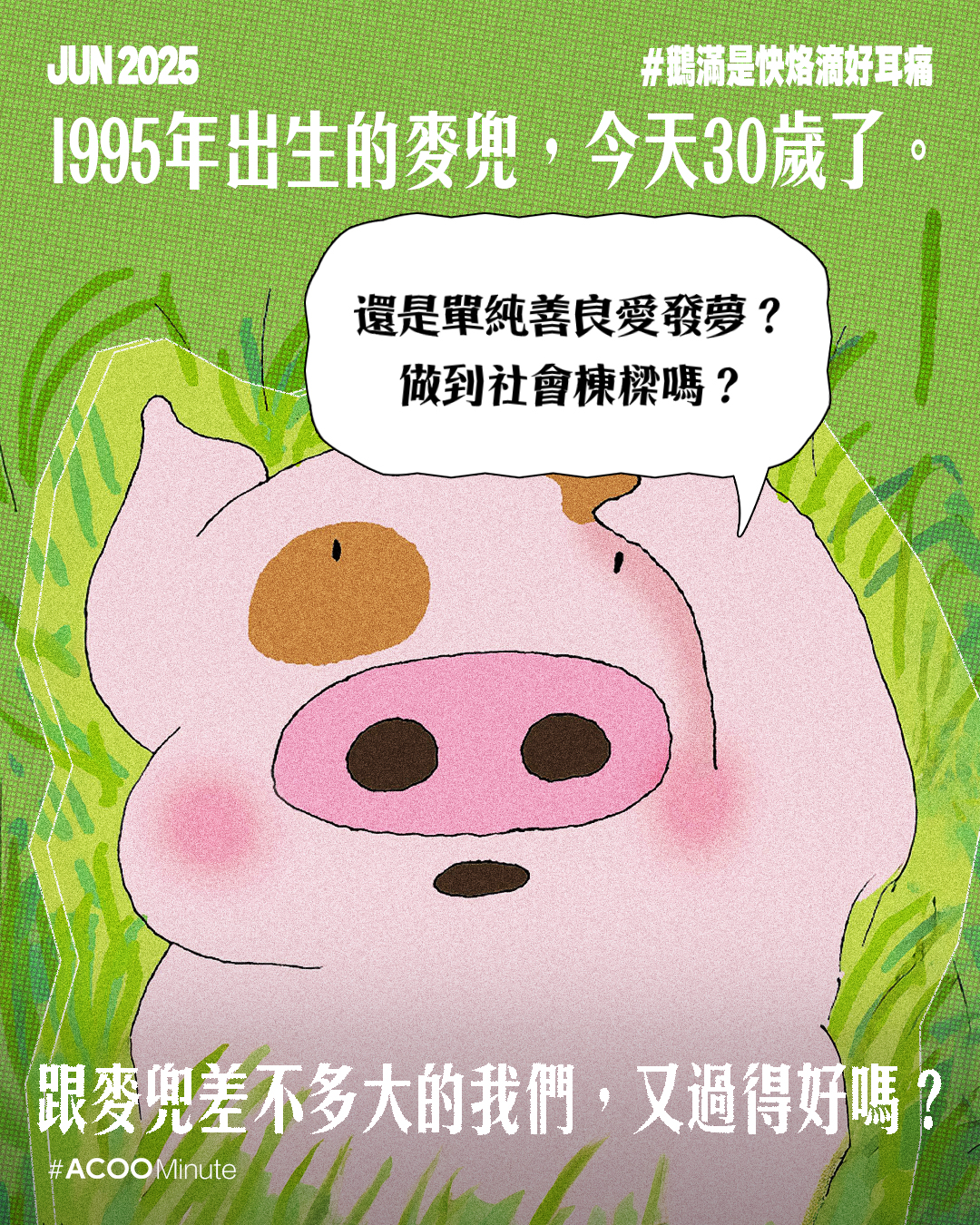 人們常說,麥兜其實是給大人看的動畫,小時候看會笑,長大後愈看愈感受到那種對於人生那淡淡的哀愁。「從前有個小朋友,有一日,他變了個佬。」麥太說的故事,長大後發現原來是真的,時光就在彈指間逝去。1995年出生的麥兜,今天30歲了,不知道還是否那樣單純善良愛發夢?做到社會棟樑嗎?跟麥兜差不多大的我們,又過得好嗎?