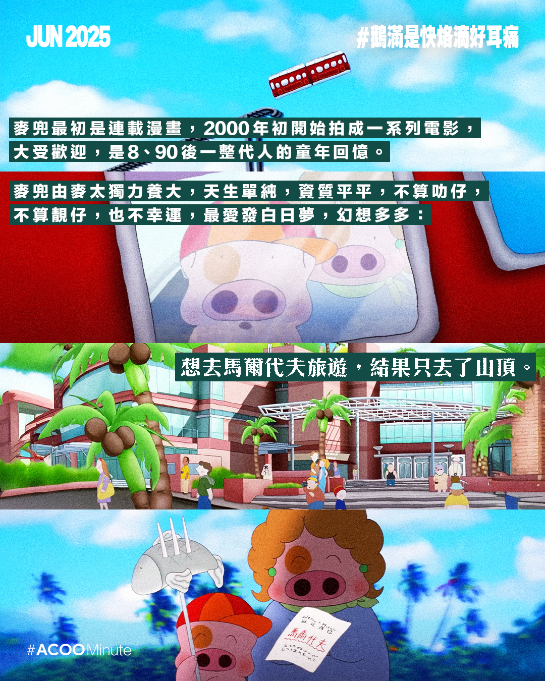 麥兜最初是連載漫畫,2000年初開始拍成一系列電影,大受歡迎,是8、90後一整代人的童年回憶。小時候愛哼電影中那些充滿童趣的歌,亦對那些無厘頭的對白相當著迷,餐廳落單、看醫生等惹笑情節,堪稱經典。主角麥兜由麥太獨力養大,天生單純,資質平平,不算叻仔,不算靚仔,也不幸運,最愛發白日夢,幻想多多:想去馬爾代夫旅遊,結果只去了山頂;想學李麗珊拿奧運金牌,結果拜師學了連比賽都沒有的項目搶包山。單純樂觀的麥兜,沒有甚麼夢發得成,在無數的嘗試與跌碰之間,度過了他的童年。