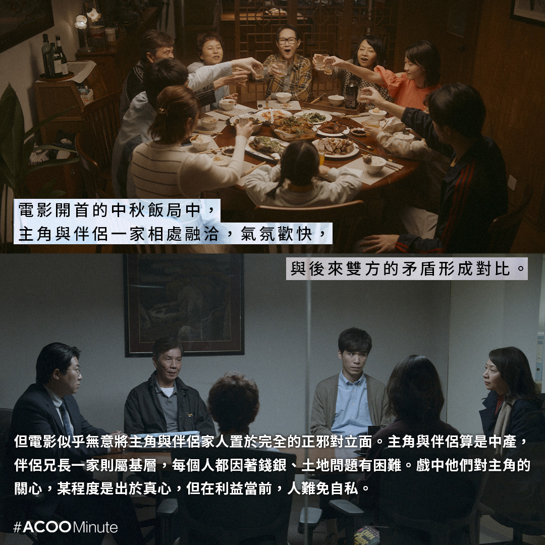 看電影的時候,很多時會替主角感到心酸又氣忿。人到暮年,伴侶離世,固然孤獨。更孤獨的是,一直以來以為伴侶家人的接納,原來只是表面。電影開首的中秋飯局中,主角與伴侶一家相處融洽,氣氛歡快,與後來雙方的矛盾形成對比。在處理後事時,主角無法維護伴侶的殯葬意願,連上香也被安排在後方,被看待為一個「朋友」,伴侶家人更要求主角交出她們的居所。雖然如此,但電影似乎無意將主角與伴侶家人置於完全的正邪對立面。主角與伴侶算是中產,伴侶兄長一家則屬基層,每個人都因著錢銀、土地問題有困難。戲中他們對主角的關心,某程度是出於真心,但在利益當前,人難免自私。