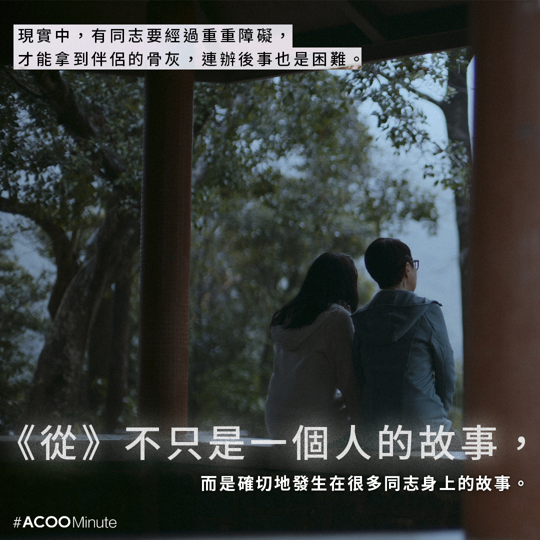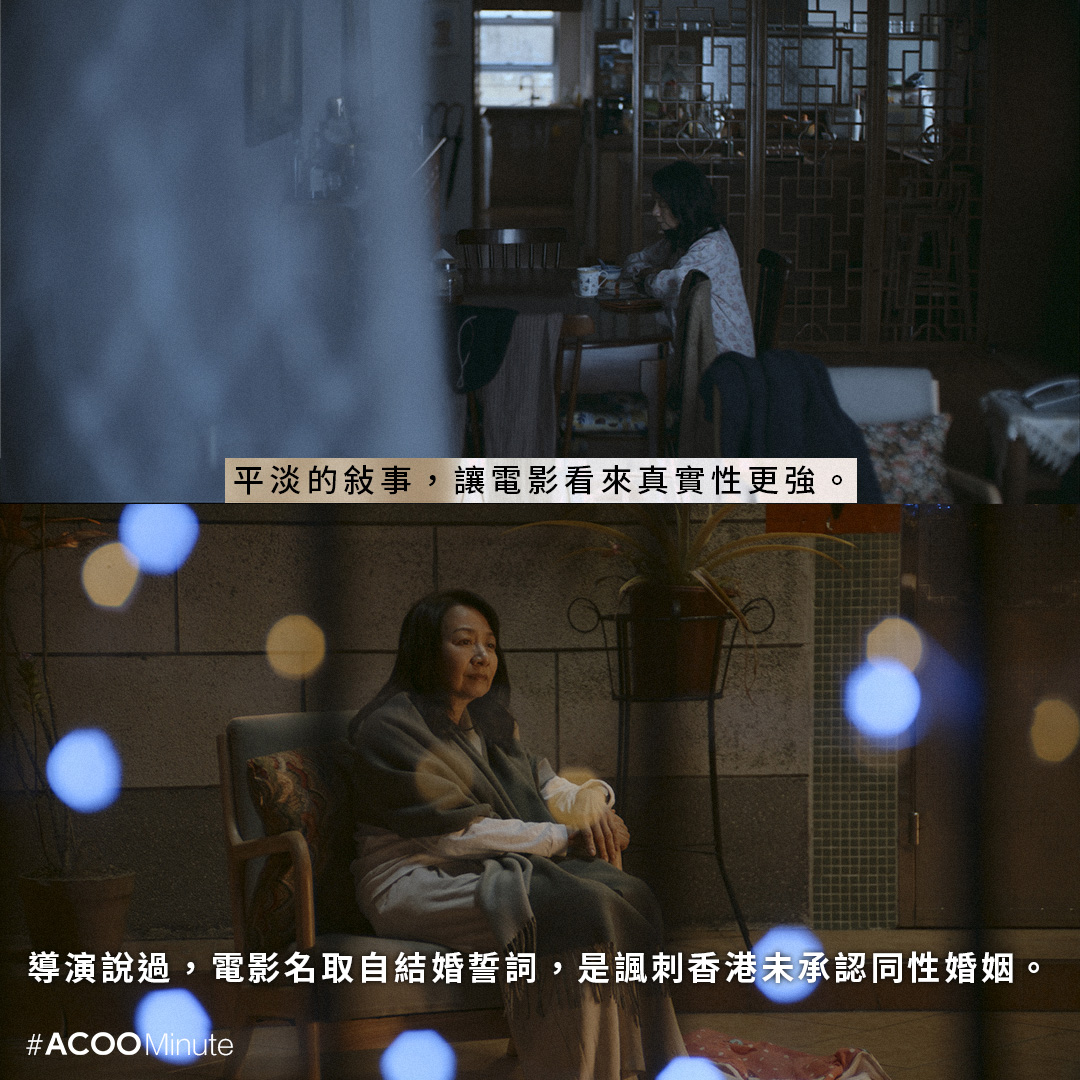 平淡的敍事,讓電影看來真實性更強。導演說過,電影名取自結婚誓詞,是諷刺香港未承認同性婚姻。現實中,有同志要經過重重障礙,才能拿到伴侶的骨灰,連辦後事也是困難。《從》不只是一個人的故事,而是確切地發生在很多同志身上的故事。