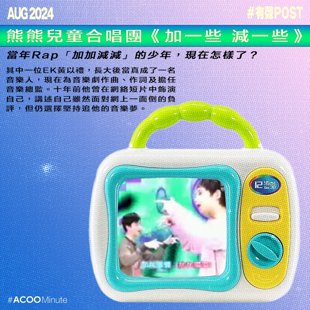 你還記得「 加加減減,減減加加⋯⋯」嗎?當年香港流行Rap,在兒歌中的這段Rap是新嘗試,但卻被人嘲笑多年。不時有網民好奇負責Rap的兩位少年近況,原來其中一位EK黃以禮,長大後當真成了一名音樂人,現在是劇場及音樂工作者,為音樂劇作曲、作詞及擔任音樂總監。十年前他曾在網絡短片中飾演自己,講述自己雖然當時面對網上一面倒的負評,但仍選擇堅持追他的音樂夢。2006年推出的《加一些減一些》,其歌詞意思大約是鼓勵大家少些否定批判,多些尊重與胸襟。事隔多年後,這對現今的社會來說,仍是很好的提醒。