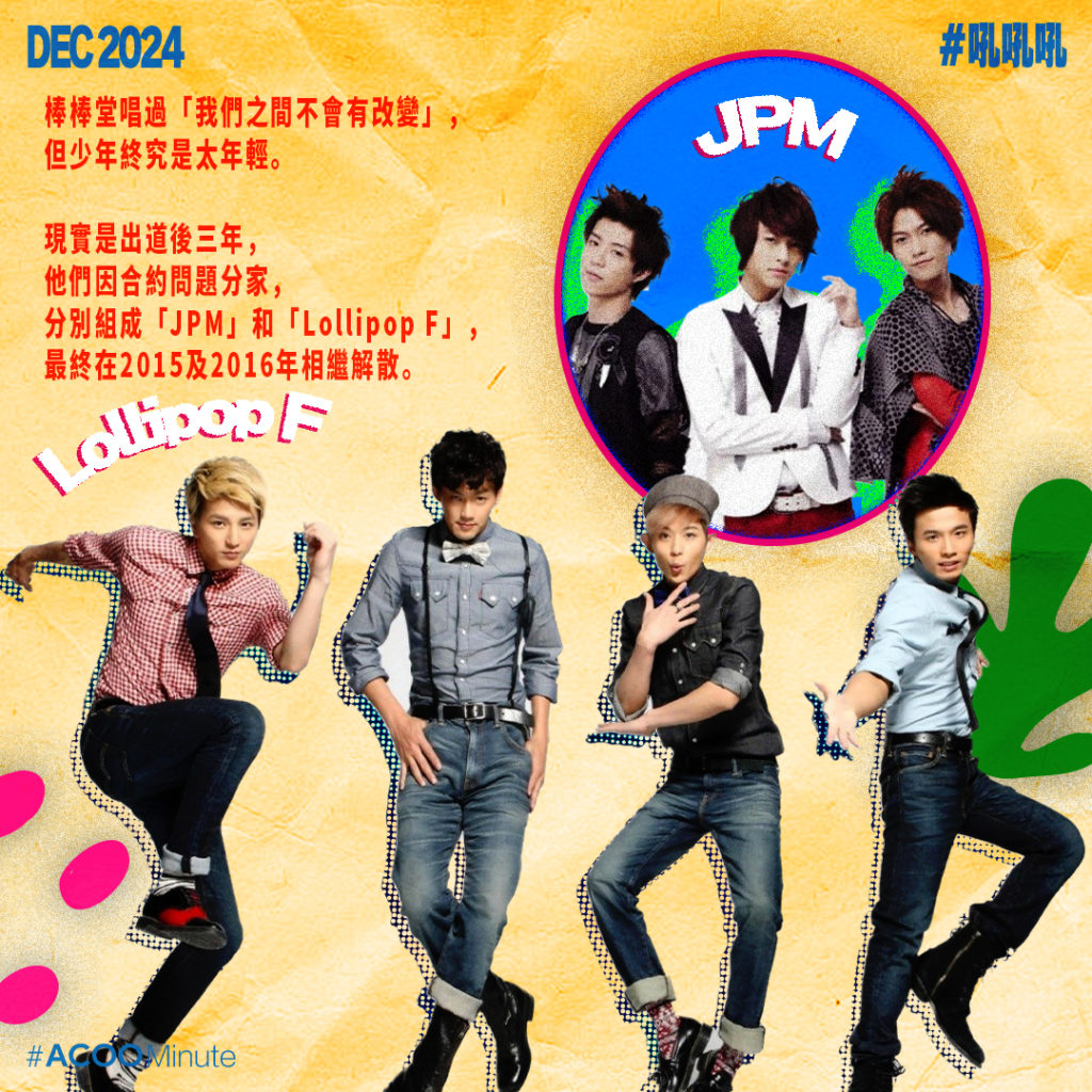 棒棒堂唱過「我們之間不會有改變」,但少年終究是太年輕。現實是出道後三年,他們因合約問題分家,王子及小傑與新加入的毛弟組成「JPM」,其餘四名成員則易名為「Lollipop F」繼續發展,兩隊各簽了不同經紀公司,最終在2015及2016年相繼解散。