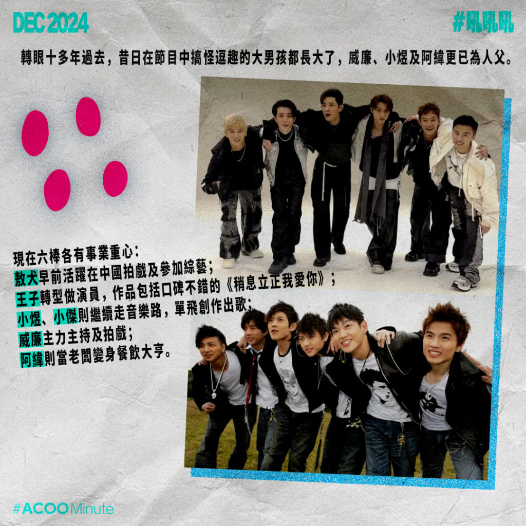 轉眼十多年過去,昔日在節目中搞怪逗趣的大男孩都長大了,威廉、小煜及阿緯更已為人父。各人各有發展:敖犬早前活躍在中國拍戲及參加綜藝;王子轉型做演員,作品包括口碑不錯的《稍息立正我愛你》;小煜、小傑則繼續走音樂路,單飛創作出歌;威廉主力主持及拍戲;阿緯則當老闆變身餐飲大亨,各有事業重心。