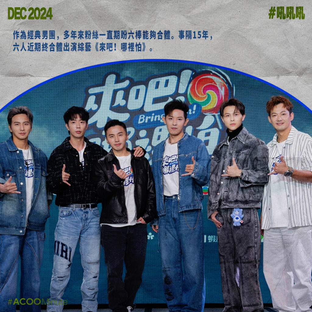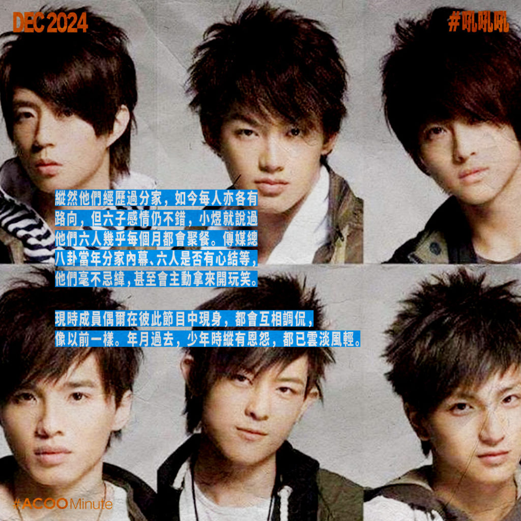 作為經典男團,多年來粉絲一直期盼六棒能夠合體。事隔15年,六人近期終合體出演綜藝《來吧!哪裡怕》,令網民激動不已。縱然他們經歷過分家,如今每人亦各有路向,但六子感情仍不錯,小煜就說過他們六人幾乎每個月都會聚餐。傳媒總八卦當年分家內幕、六人是否有心結等,他們毫不忌緯,甚至會主動拿來開玩笑。現時成員偶爾在彼此節目中現身,都會互相調侃,像以前一樣。年月過去,少年時縱有恩怨,都已雲淡風輕。