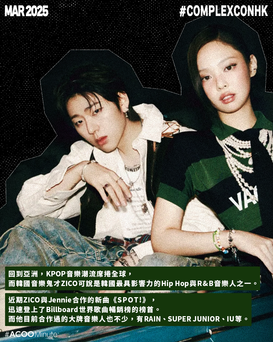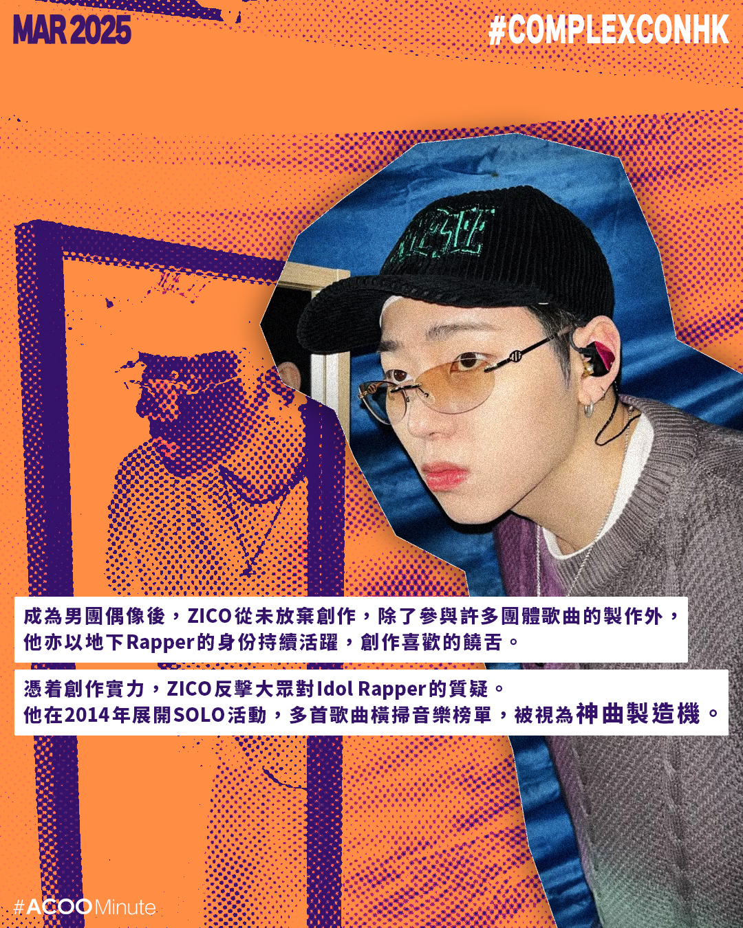 韓國音樂鬼才 ZICO 可說是韓國最具影響力的Hip Hop與R&B音樂人之一,他近期與Jennie合作的新曲《SPOT!》,迅速登上了Billboard世界歌曲暢銷榜的榜首。歌手爭相與他合作,目前合作過的音樂人有RAIN、SUPER JUNIOR、IU等,他亦曾以南韓文化界代表出席南北韓高峰會,足證其影響力。