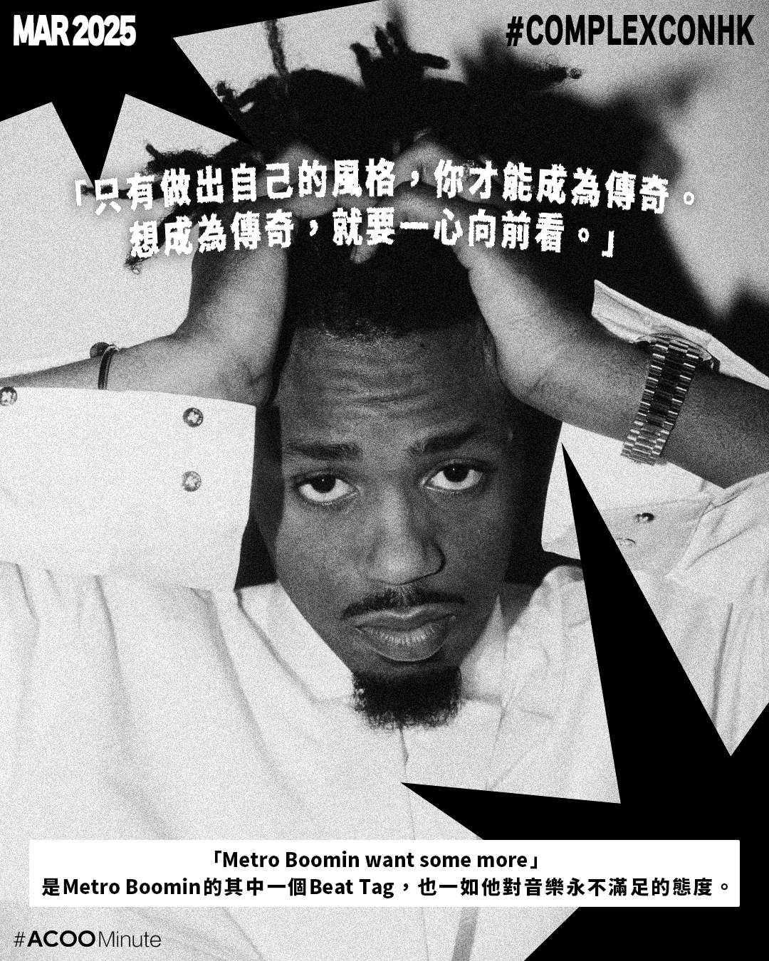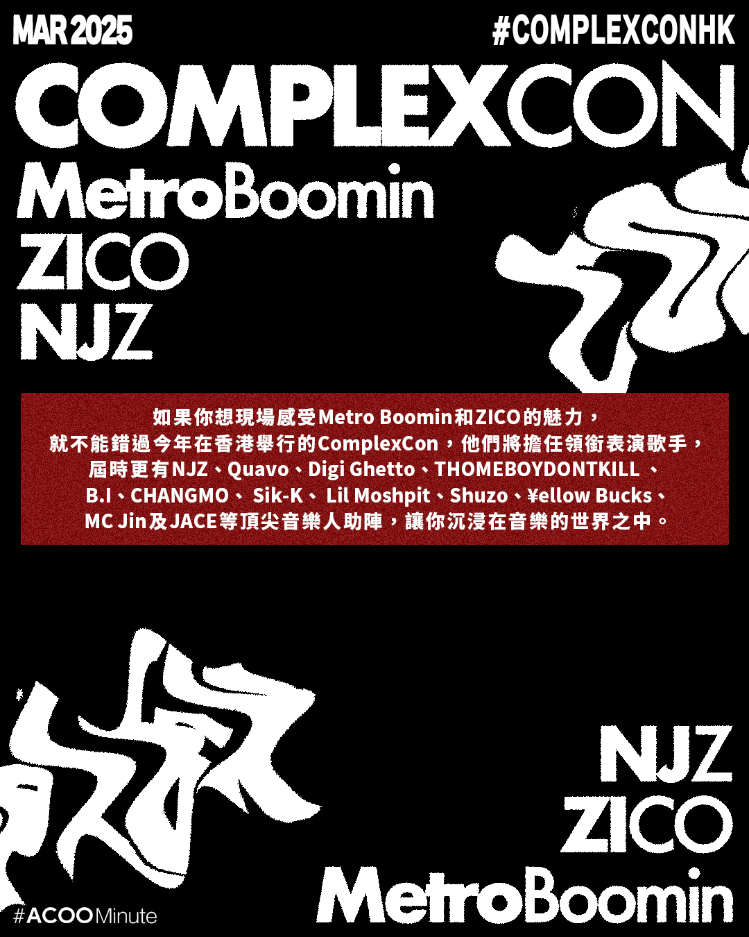 Metro Boomin和ZICO的音樂故事,教會我們對於喜歡的事物,要敢於嘗試,永遠追求更多,這與Hip Hop勇於追求自我的精神,其實一脈相承。如果你想現場感受Metro Boomin和ZICO的魅力,就不能錯過今年在香港舉行的ComplexCon,他們將擔任領銜表演歌手,屆時更有Quavo、Digi Ghetto、THOMEBOYDONTKILL 、 B.I、CHANGMO、 Sik-K、 Lil Moshpit、Shuzo、¥ellow Bucks、MC Jin及JACE等頂尖音樂人助陣,讓你沉浸在音樂的世界之中。