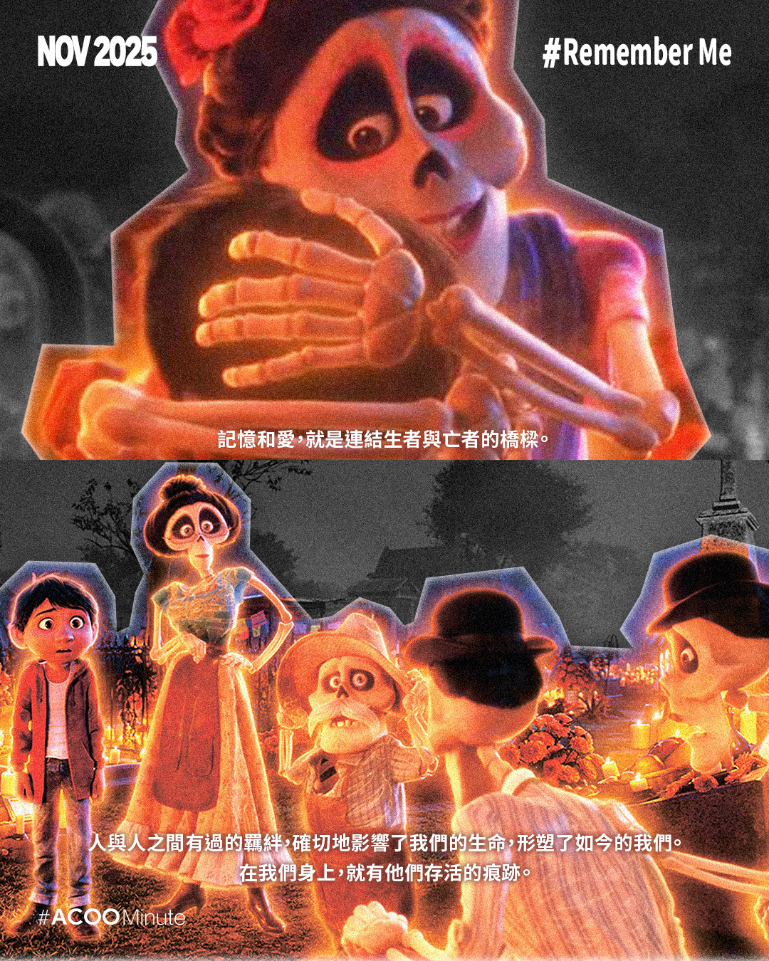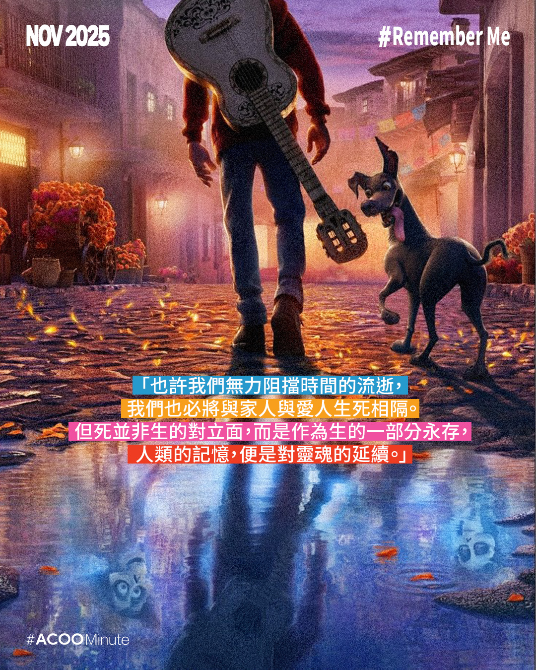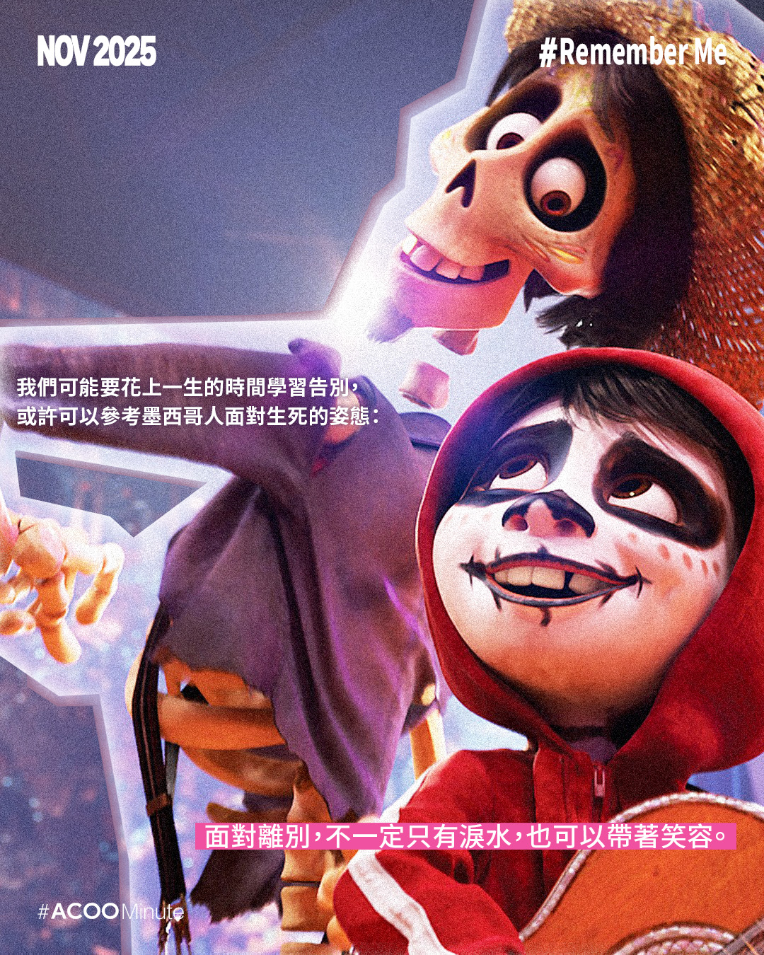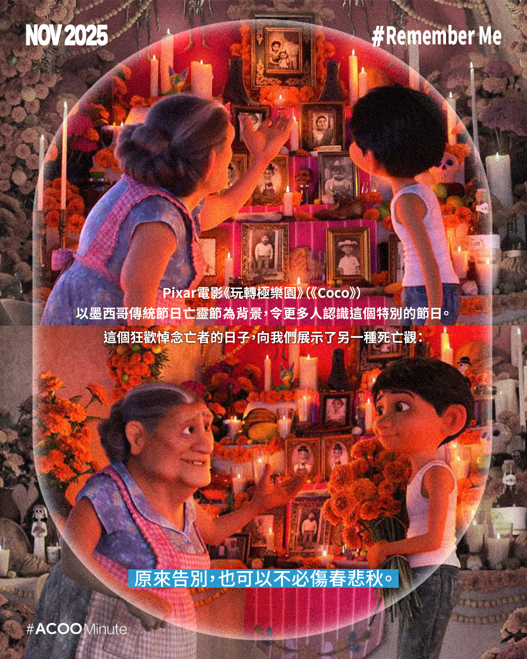 在電影《玩轉極樂園》中,亡靈會存在於另一個世界,只有人間還有人記得他們,他們就不會消失;但一旦被遺忘,便會迎來所謂的「終極死亡」。記憶和愛,就是連結生者與亡者的橋樑。人與人之間有過的羈絆,確切地影響了我們的生命,形塑了如今的我們。在我們身上,就有他們存活的痕跡。