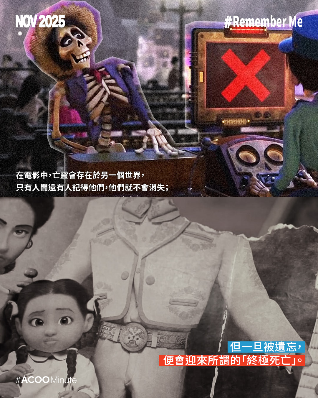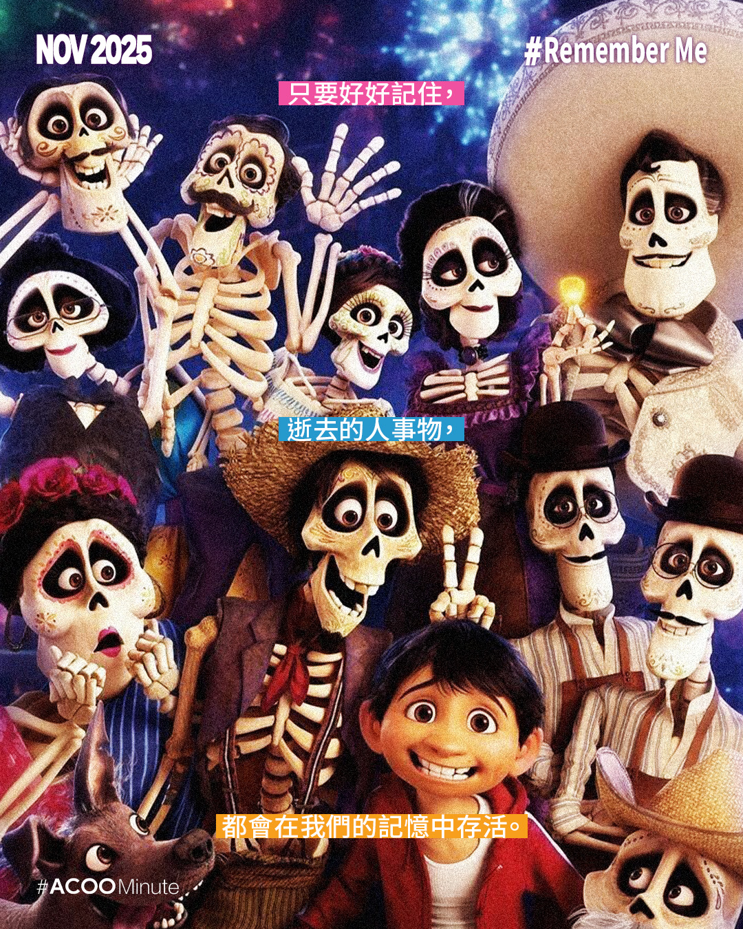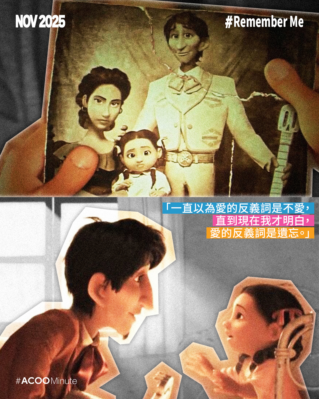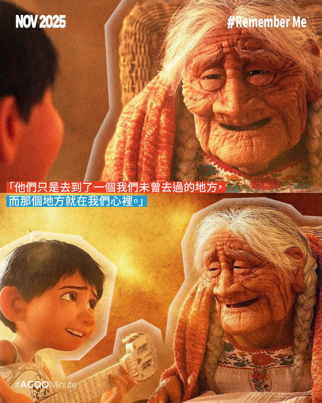 在電影《玩轉極樂園》中,亡靈會存在於另一個世界,只有人間還有人記得他們,他們就不會消失;但一旦被遺忘,便會迎來所謂的「終極死亡」。記憶和愛,就是連結生者與亡者的橋樑。人與人之間有過的羈絆,確切地影響了我們的生命,形塑了如今的我們。在我們身上,就有他們存活的痕跡。