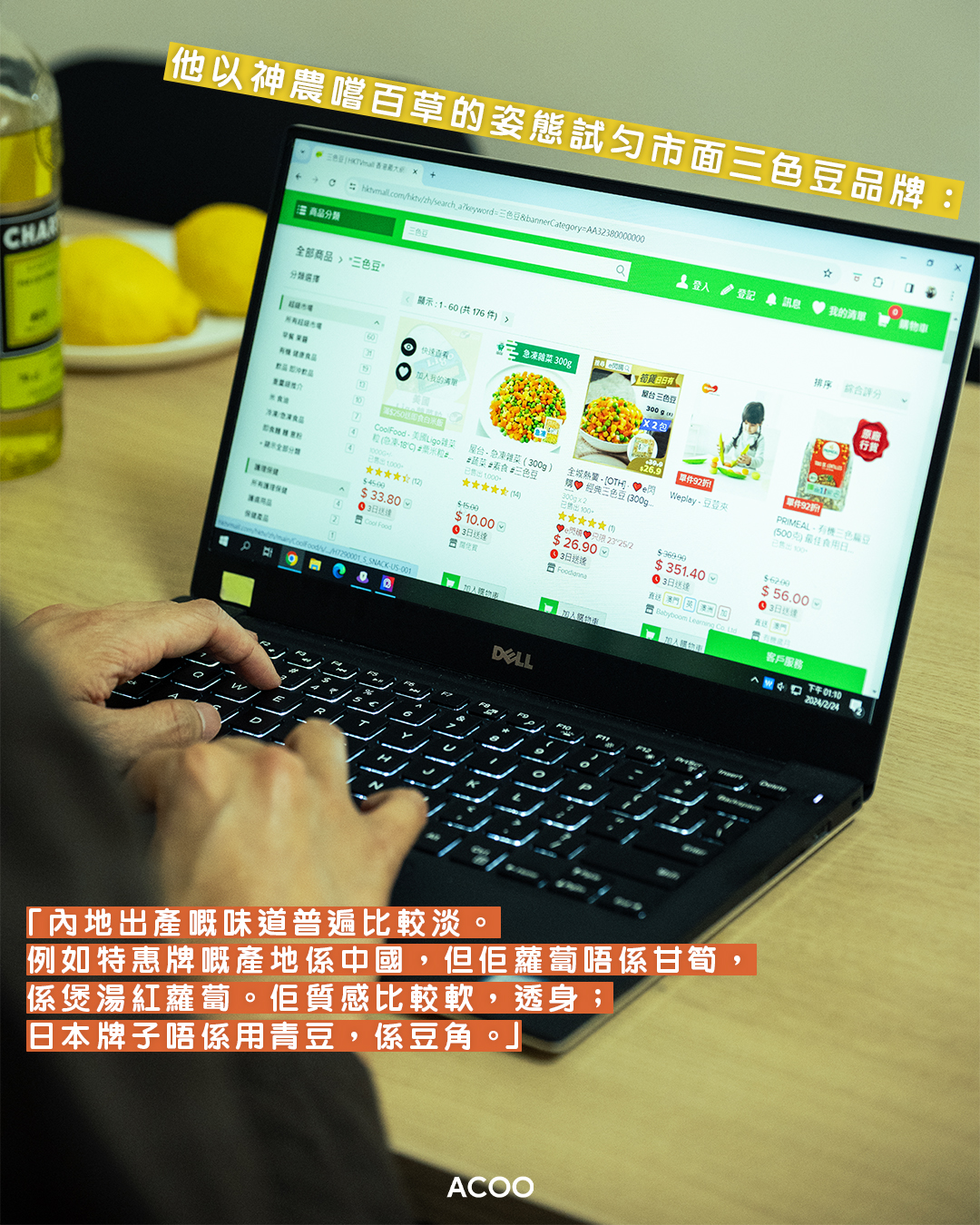 這樣的煮食配搭,聽起來毫不吸引,但大使對於用甚麼品牌的三色豆來煮食卻很講究:「大陸出產嘅味道普遍比較淡。例如特惠牌嘅產地係中國,但佢蘿蔔唔係甘筍,係煲湯紅蘿蔔。佢質感比較軟,透身。」至於部份日本牌子就不是用青豆,而是用豆角。打開他的雪櫃,已有 3 個牌子的三色豆。大使至今嘗過起碼 6 款品牌,於他而言,價錢是主要比較因素,例如Meadows,一包 500g,盛惠 24 元,但在 hktvmall 買外國牌子 Ligo,1kg只需 30 元,口感也較中國產的好。
