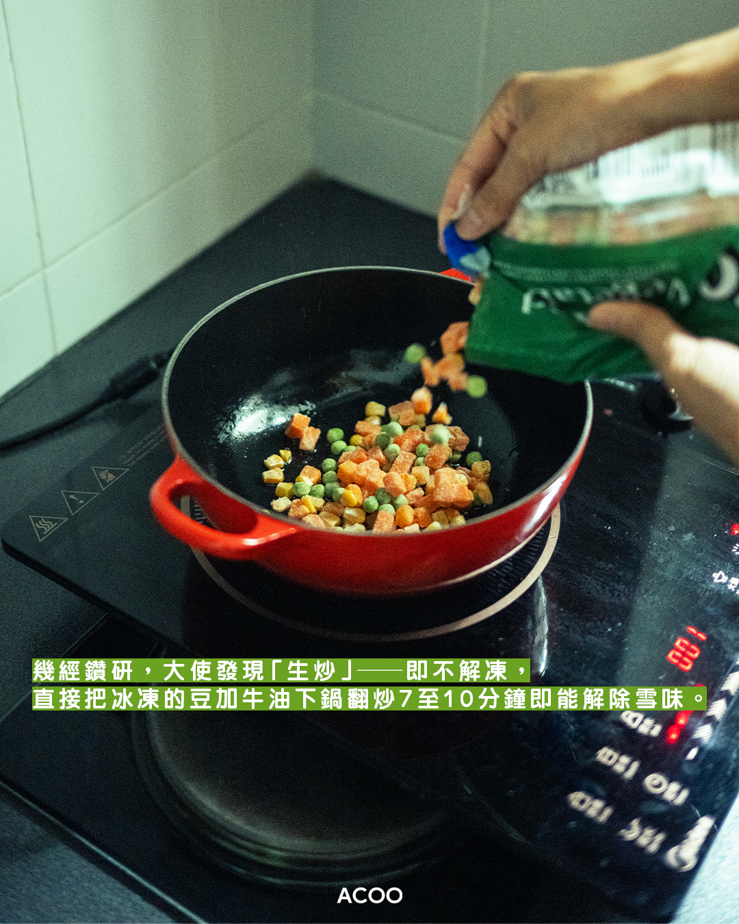 大使知道大家普遍討厭三色豆「雪味」及「草青味」,幾經鑽研,他發現「生炒」——即不解凍,直接把冰凍結霜的豆加牛油下鍋翻炒 7 至 10 分鐘即能去除雪味。背後原理不詳,但深怕大家不信,大使即席拿出 Le Creuset 生炒了一盤三色豆,所言非虛 !