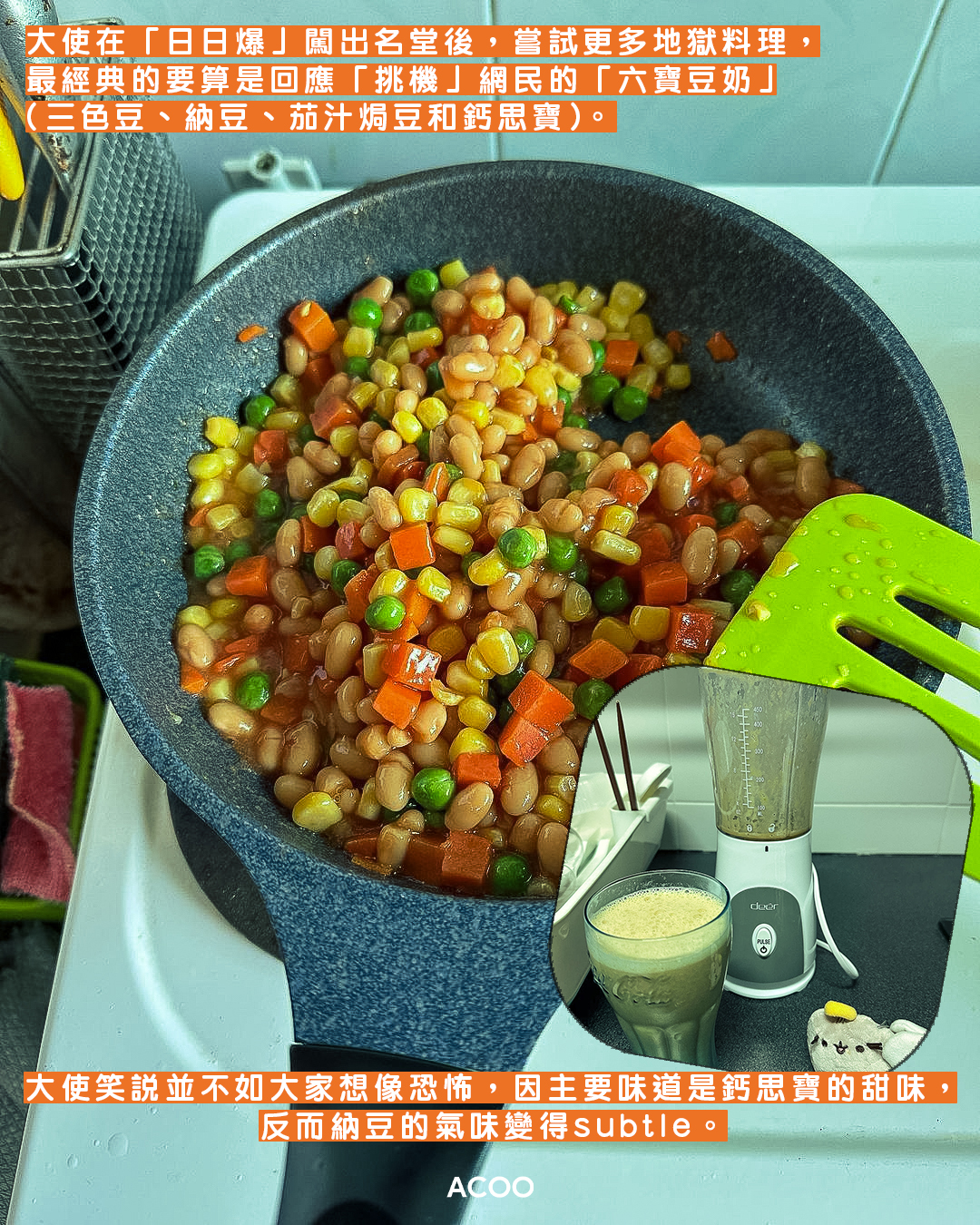 後來,大使再順勢開設自己的 ig 專頁。除了有格價、個人感受外,他更「變本加厲」,嘗試更多地獄料理。最經典要數回應「挑機」網民的「六寶豆奶」(三色豆、納豆、茄汁焗豆和鈣思寶)。大使笑說並不如大家想像恐怖,因鈣思寶的甜味反而令納豆的氣味變得 subtle。除此以外,他更將三色豆着上身:口罩、tote bag,更自製兩件三色豆 T,萬聖節當天穿起它到蘭桂坊派發盒裝三色豆。