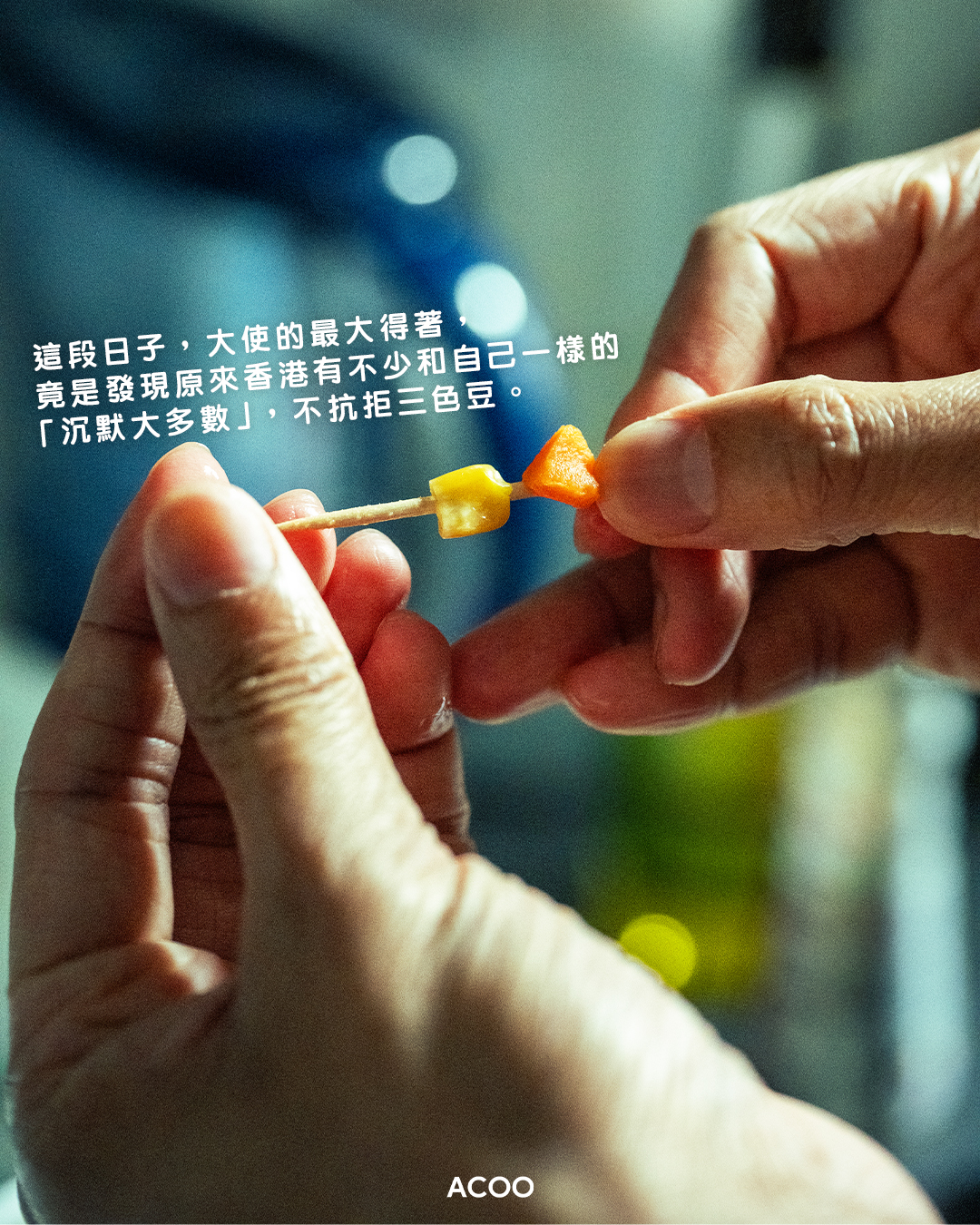 這段日子,大使的最大得着,是發現香港有不少和自己一樣的「沉默大多數」。他時不時會收到網友報料,分享三色豆有趣新聞或資訊,例如有餐廳推出「三色豆 pizza」。而大使友人每次相約野餐,他都會準備三色豆佳餚,這個「怪癖」在朋友圈子中已見怪不怪,「唔肯試嘅我唔會勉強,但好多人都會覺得無想像中咁伏」。