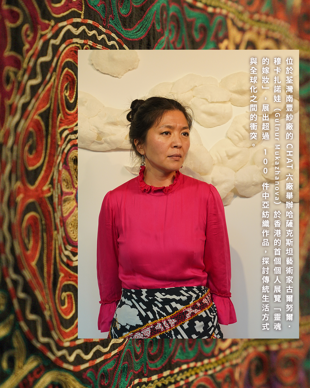 位於荃灣南豐紗廠的CHAT六廠(六廠紡織文化藝術館),舉辦哈薩克斯坦藝術家古爾努爾.穆卡扎諾娃(Gulnur Mukazhanova)的首個個人展覽「靈魂的嫁妝」,展出超過 100 件中亞紡織作品,以女性視角探討傳統的意義與現代生活之間的衝突。穆卡扎諾娃出生於哈薩克斯坦,目前在柏林生活和工作,擅長結合中亞傳統和當代藝術創作。中亞與我們在地理上不算近,但處身社會洪流中,如何擁抱自己的身份,我們也許有著相似的感受。
