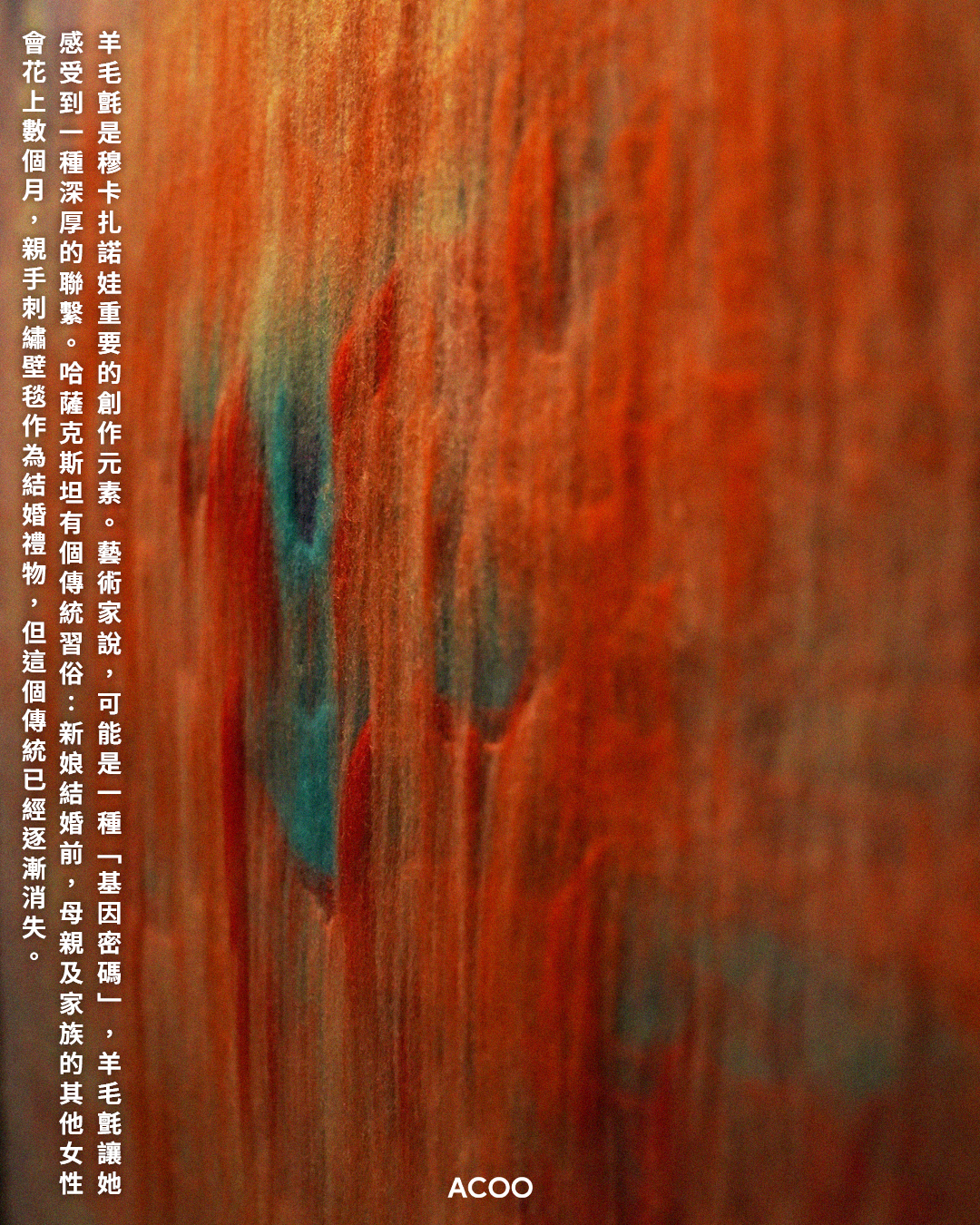 羊毛氈是穆卡扎諾娃重要的創作元素。展覽的入口有道蒙古包的大型氈門,是藝術家從哈薩克斯坦帶來香港,讓人首先感受氈布那種厚重的質感,湊近還能嗅到羊毛的味道。穆卡扎諾娃說,可能是一種「基因密碼」,羊毛氈讓她感受到一種深厚的聯繫。哈薩克人是遊牧民族,常用毛氈來建造蒙古包、製作衣物、家居用品、餐具、地毯等。這種毛氈文化在哈薩克斯坦中部還盛行,但在她家鄉所屬的地區已幾乎消失。