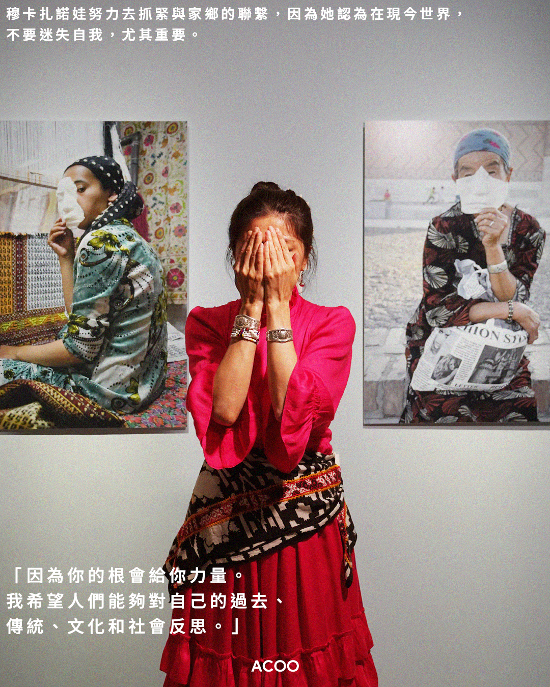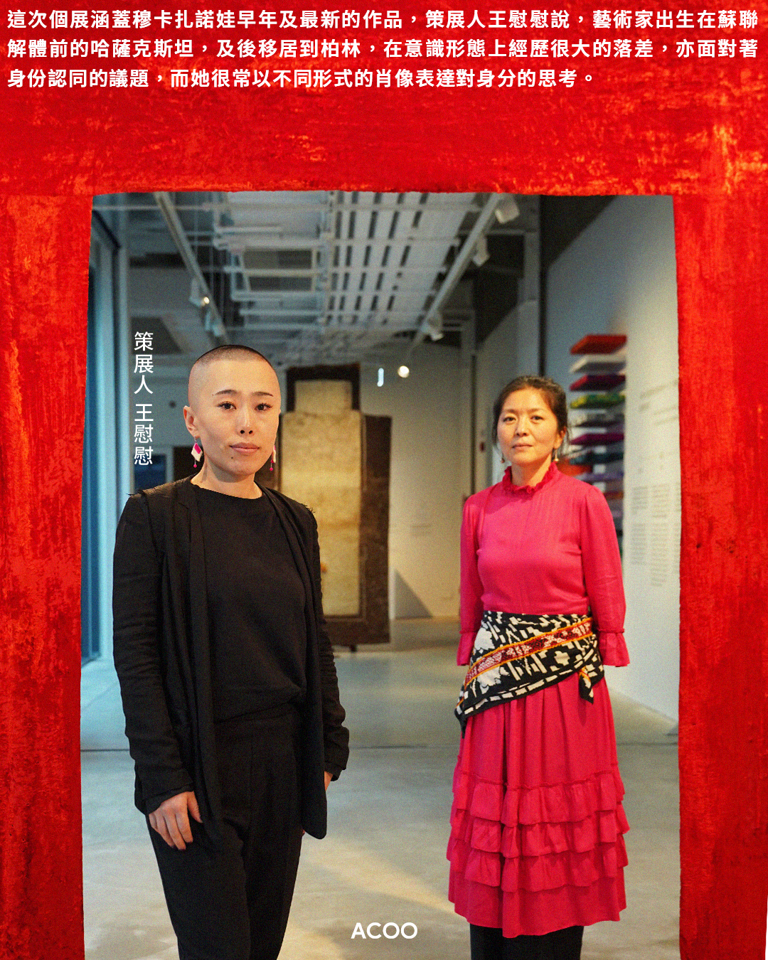 這次個展涵蓋穆卡扎諾娃早年及最新的作品,包括毛氈繪畫、毛氈雕塑、拼布裝置、攝影、影像等等。王慰慰說,穆卡扎諾娃出生在蘇聯解體前的哈薩克斯坦,及後移居到柏林,在意識形態上經歷很大的落差,亦面對著身份認同的議題,而她很常會以不同形式的肖像表達對身分的思考。
