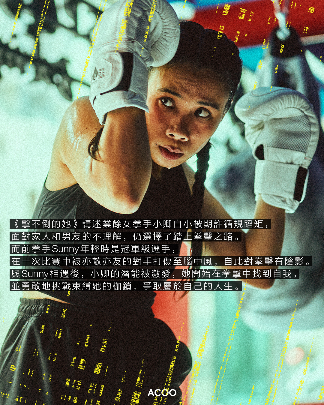 《擊不倒的她》講述業餘女拳手小卿自小被期許循規蹈矩,面對家人和男友的不理解,仍選擇了挑戰傳統,踏上拳擊之路;前拳手Sunny年輕時是冠軍級選手,在一次比賽中被亦敵亦友的對手打傷至腦中風,自此對拳擊有陰影。與Sunny相遇後,小卿的潛能被激發,她開始在拳擊中找到自我,並勇敢地挑戰束縛她的枷鎖,爭取屬於自己的人生。