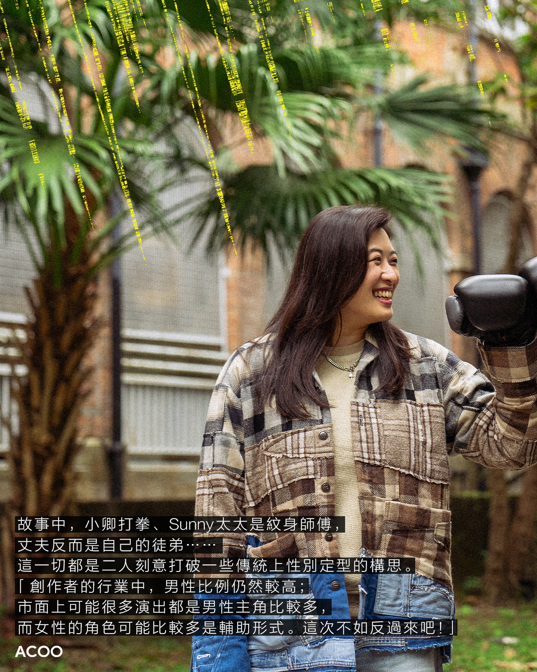 故事中,小卿打拳、Sunny太太是紋身師傅,丈夫反而是自己的徒弟⋯⋯這一切都是二人刻意打破一些傳統上性別定型的構思。「創作者的行業中,男性比例仍然較高;市面上可能很多演出都是男性主角比較多,而女性的角色可能比較多是輔助形式。這次不如反過來吧!既然有機會寫一個劇本,我希望能推動更多女性角色的發展。我就說主角要是女生,就用她來打破定型。」