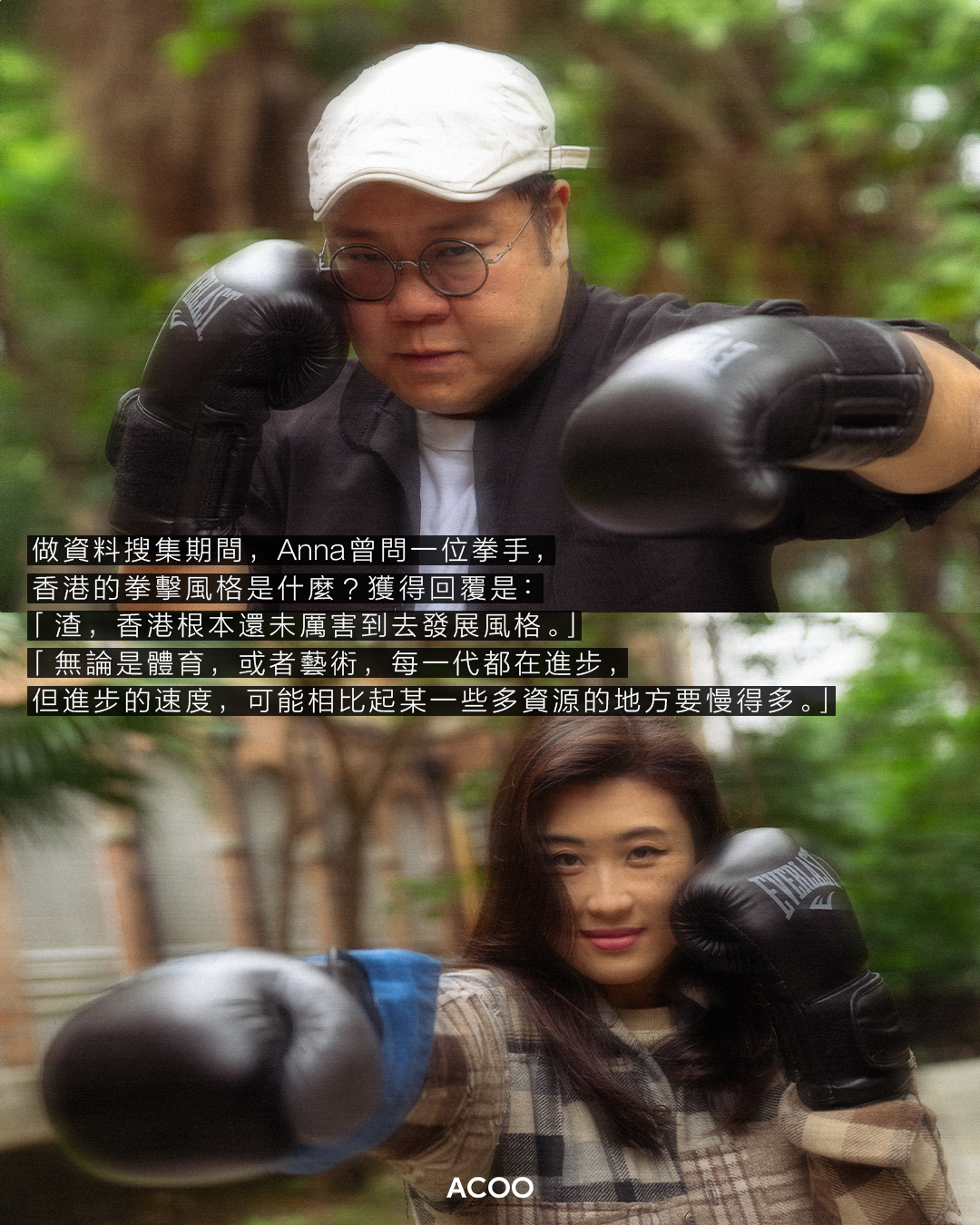 做資料搜集期間,Anna曾問一位拳手,香港的拳擊風格是什麼?獲得回覆是「渣,香港根本還未厲害到去發展風格。」Anna認為藝術和體育界都面對很多挑戰。「無論是體育,或者藝術,在香港都說不上是社會上最被看重的。我覺得這兩個範疇的人,大家都很有心想做好。每一代都在進步,但進步的速度,可能相比起某一些多資源的地方要慢一點。」