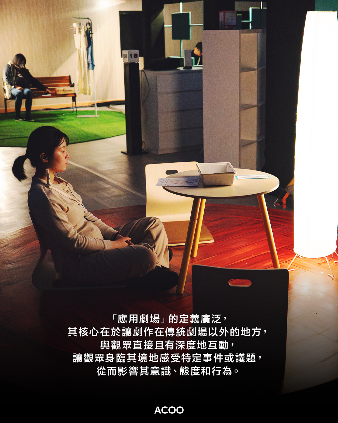「應用劇場」的定義廣泛,其核心在於讓劇作在傳統劇場以外的地方,與觀眾直接且有深度地互動,讓觀眾身臨其境地感受特定事件或議題,從而影響其意識、態度和行為。