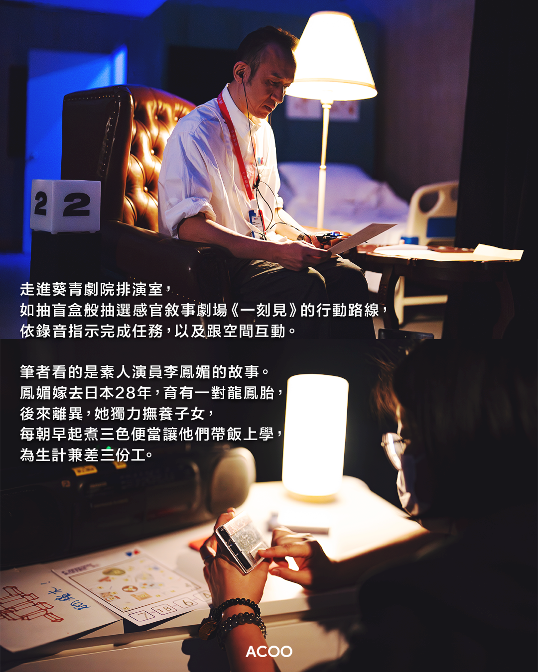 鳳媚遠嫁日本,後來離異,她獨力撫養子女,每朝早起煮三色便當讓他們帶飯上學,為生計兼差三份工。振輝說他當時聽到這裏,忽爾感概母愛是「無私奉獻」,而那份愛不應被當成理所當然。戴着深入耳窩的耳機,鳳媚的自白從耳窩傳到心窩,正如振輝所言,觀眾那刻彷彿進入了鳳媚的視角。