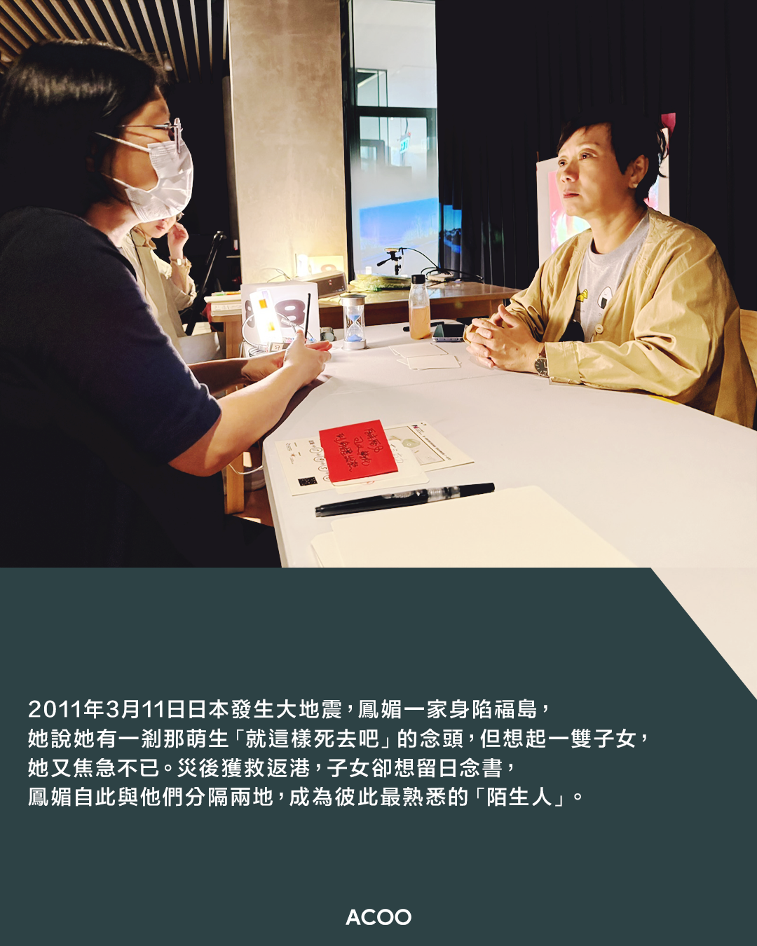 2011年3月11日日本發生大地震,鳳媚一家身陷福島,她曾萌生「就這樣死去吧」的念頭,但想起一雙子女,她又焦急不已。災後獲救返港,子女卻想留日念書,鳳媚自此與他們分隔兩地,成為彼此最熟悉的「陌生人」。在劇場路線的最後一站,筆者與鳳媚相見,問她怎麼從災難中撐過來,她說她當時在清潔街道途中,偶然拾到一張紙條,上面寫着類似只要是上天給予的,無論苦與福,都要照單全收的內容。這句話聽上去有種「生而為人,最後也只能這樣」的無力感,卻成為鳳媚走下去的力量。