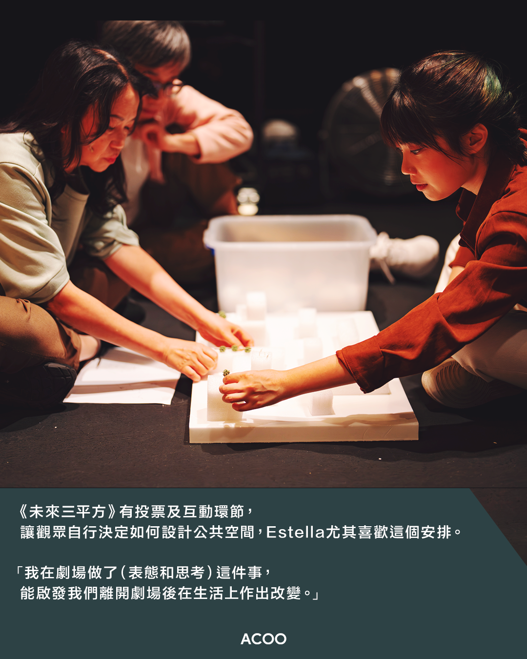 所謂「有個way out」,應用劇場說到底是要適當「應用」。像是應用劇場節另一節目「好奇習作:議題劇場工作室《未來三平方》」,26名編作演員蒐集資料和田野考察,研究與公共空間有關的學術著作,再進行分組報告,經多重討論才轉化成舞台作品。編作演員會扮演學者和市民等角色,藉他們的表演具體呈現艱澀的理論、數據和資料等,引發觀眾與演員對公共空間使用的思辯。表演最後有投票環節,讓觀眾自行決定如何設計公共空間,Estella尤其喜歡這個安排,她說:「我在劇場做了(表態和思考)這件事,能啟發我們離開劇場後在生活上作出改變。」