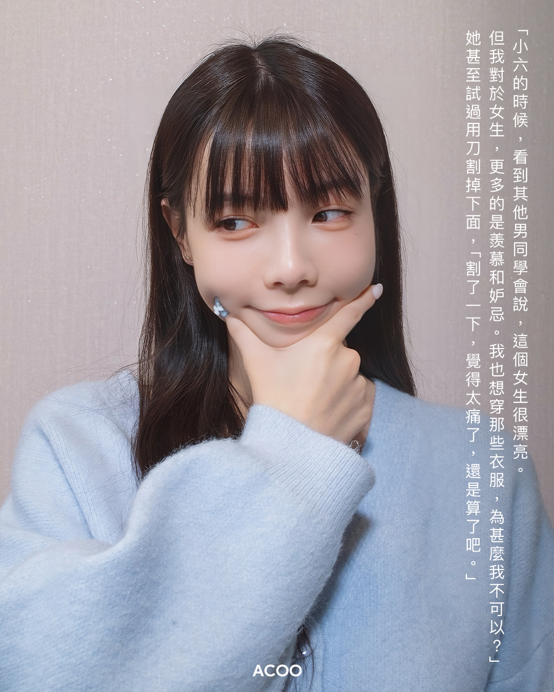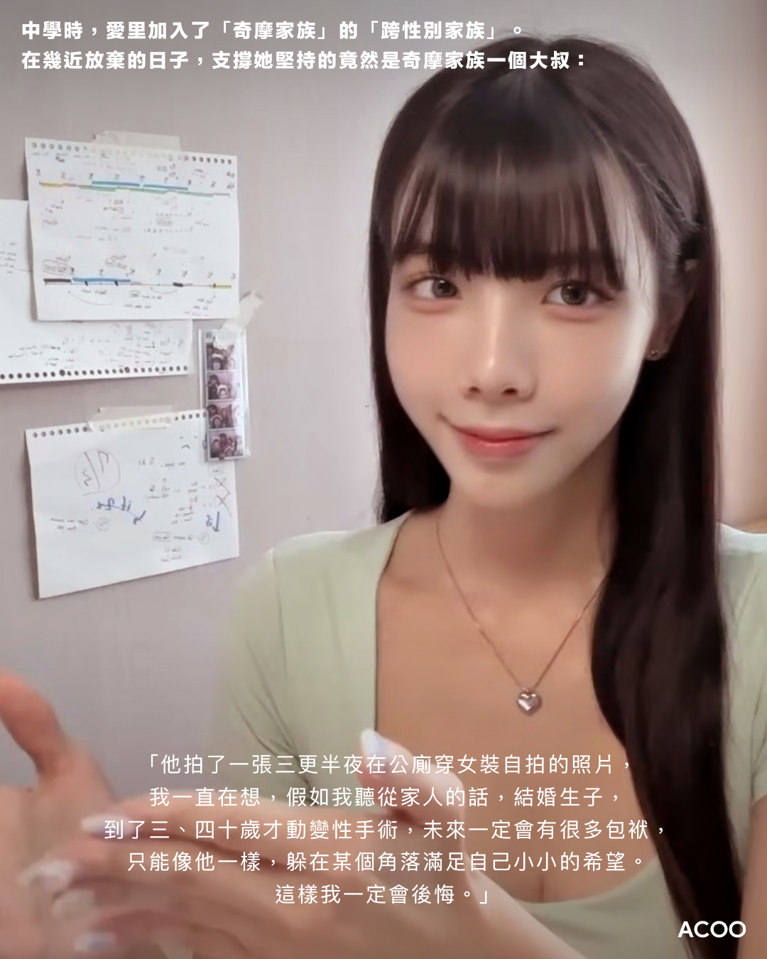 早於愛里小學的時候,她已覺得自己「怪怪」的,「小六的時候,看到其他男同學會說,這個女生很漂亮。但在我來說,更多的是羨慕和妒忌。我也想穿那些衣服,為甚麼我不可以?」高中時,她看了日本跨性別模特兒椿彩奈撰寫的《我是男校畢業的女生》,明白到自己大概也是一個跨性別人士,長在一個錯誤的軀體內。她甚至嘗試用刀割掉下面,「割了一下,覺得太痛了,還是算了吧」。