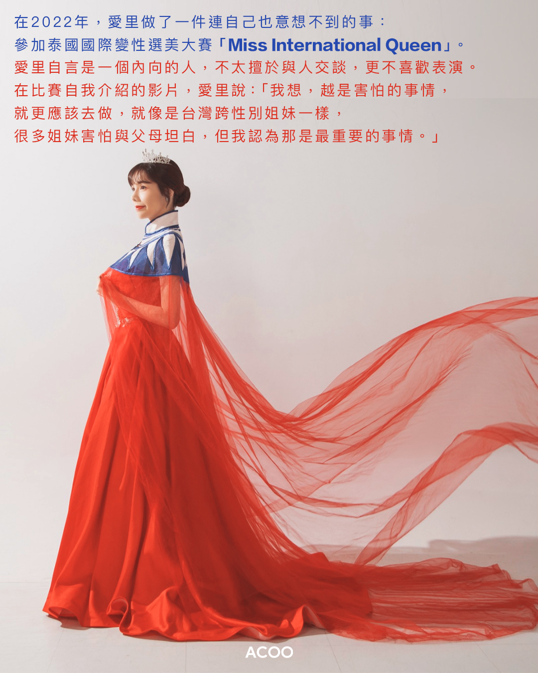 在2022年,愛里做了一件連自己也意想不到的事:參加泰國國際變性選美大賽「Miss International Queen」。這個選美從2004年開始舉辦,是全球最具影響力的跨性別選美大賽。愛里自言是一個內向的人,不太擅於與人交談,更不喜歡表演。在比賽自我介紹的影片,愛里說:「我想,越是害怕的事情,就更應該去做,就像是台灣跨性別姐妹一樣,很多姐妹害怕與父母坦白,但我認為那是最重要的事情。」