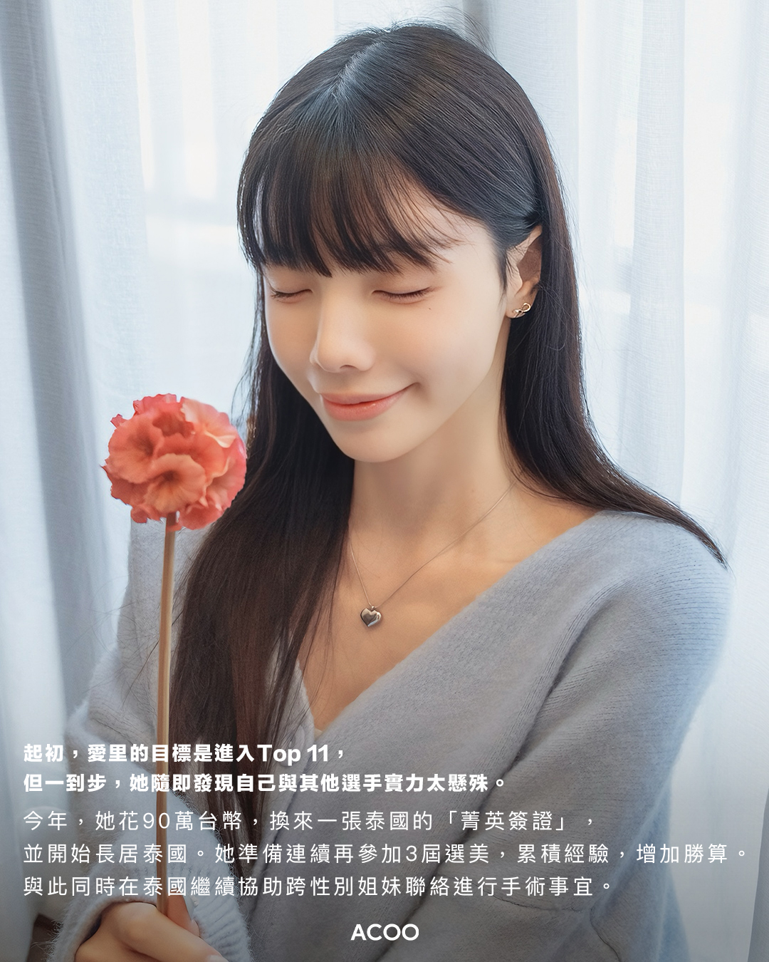 但,這個世界才沒有這麼多英雄勵志片。一如所料,愛里並沒獲得名次。回想起兩年前的那場選美比賽,愛里總覺得當年沒有認真準備,讓她留有遺憾。今年,她花90萬台幣,換來一張泰國的「菁英簽證」,並開始長居泰國。她準備連續再參加3屆選美,與此同時在泰國繼續協助跨性別姐妹聯絡進行手術事宜。「2025、26、27。這樣,我每一次參賽,所得到的經驗,都可以被下一次參賽所用,更可以最大化降低成本」。愛里的終極計畫,是能夠固定而持續地資助缺乏資源的姐妹,到泰國完成性別置換手術。