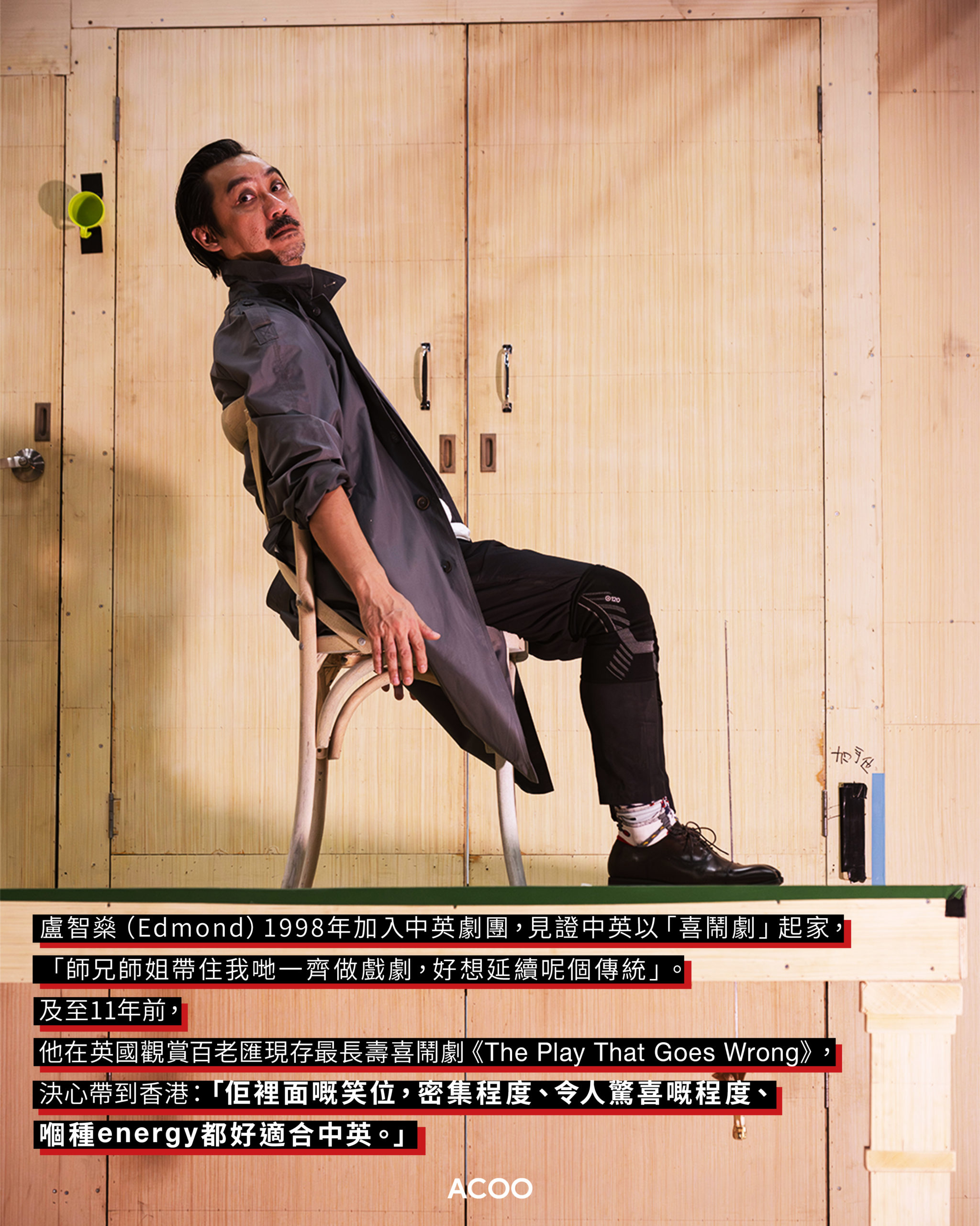 盧智燊1998年加入中英劇團,至今27年,見證中英以「喜鬧劇」起家,「師兄師姐帶住我哋一齊做喜劇,好想延續呢個傳統」。及至11年前,他在英國觀賞百老匯現存最長壽喜鬧劇《The Play That Goes Wrong》,那時已覺得此劇本很適合中英,「佢裡面嘅笑位,密集程度、令人驚喜嘅程度、嗰種energy都好適合中英。」今年,眼見不少地區都陸續購入劇本版權,也有感劇團此時應該能夠處理相關技術,他遂決定洽談版權,這就是《你個戲壞咗呀!》的起點。
