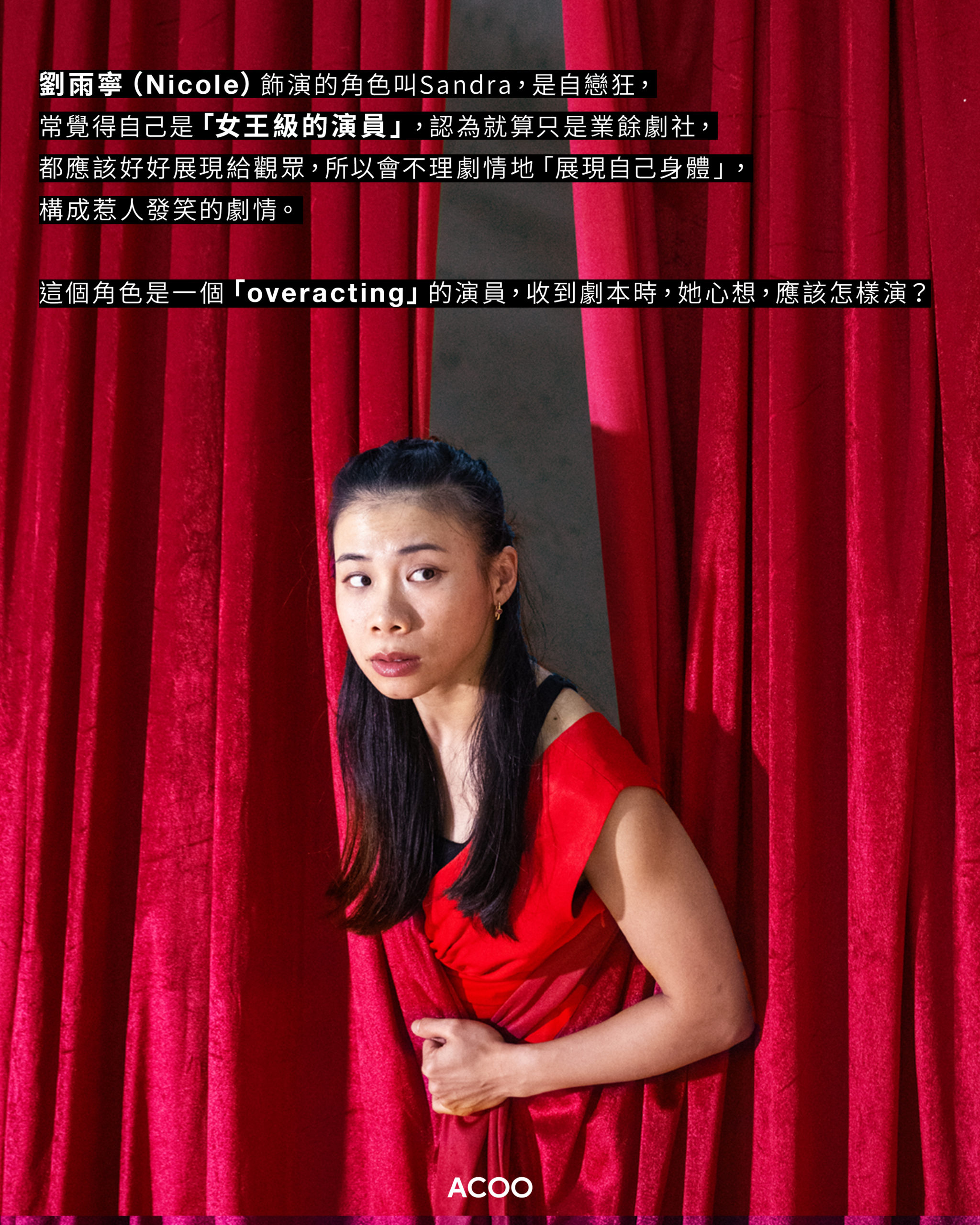 其中一個讓此劇本搞笑的點,是每個角色們都各自對表演有著荒謬的理解和執著。例如有角色極度渴望掌聲,會在演出中途突然「打破第四面牆」向觀眾鞠躬;又例如劉雨寧飾演的角色叫Sandra,是自戀狂,常覺得自己是「女王級的演員」,認為就算只是業餘劇社,都應該好好展現給觀眾,所以會不理劇情地「展現自己身體」,構成惹人發笑的劇情。這個角色是一個「overacting」的演員,收到劇本時,她心想,應該怎樣演?
