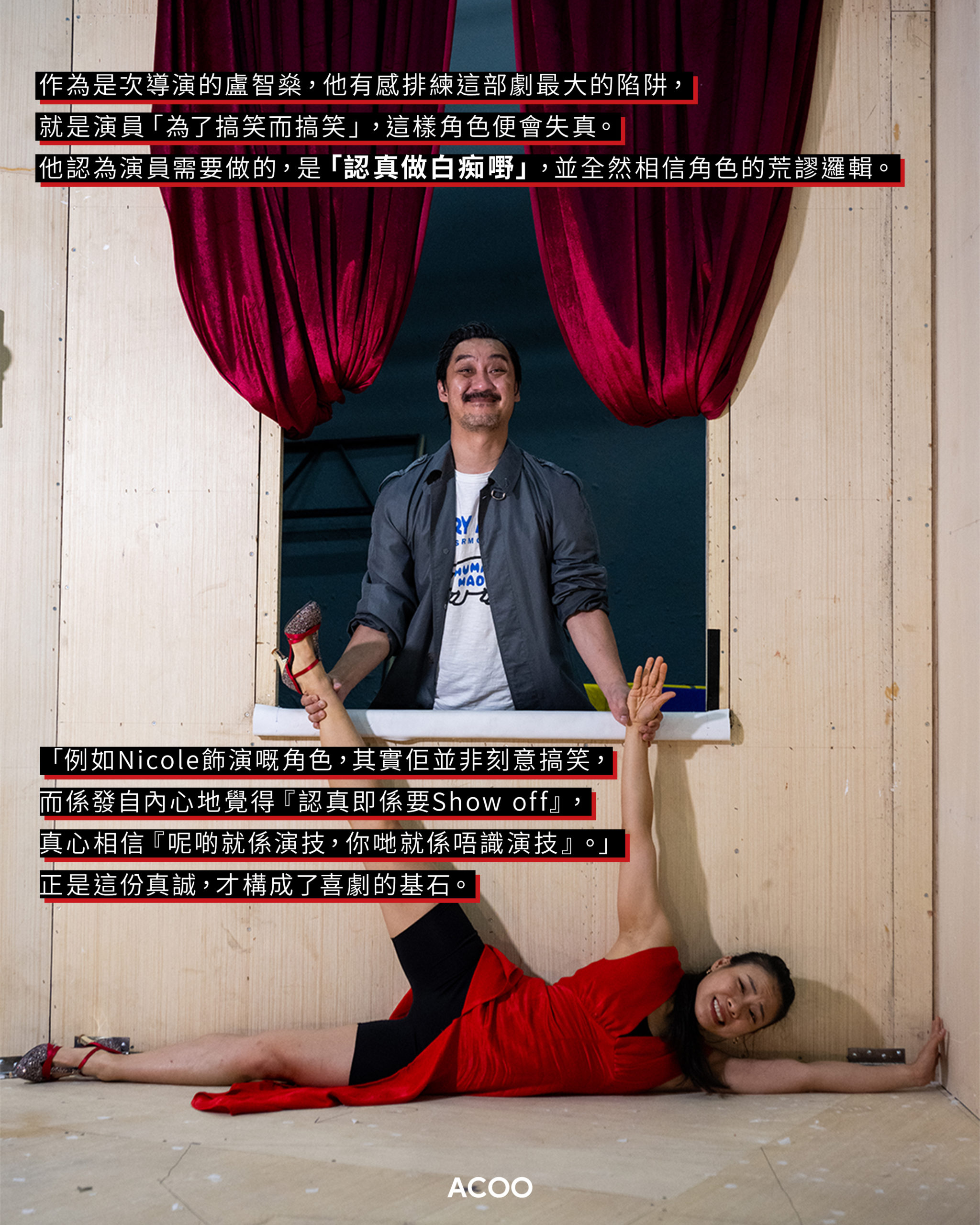 作為是次導演的盧智燊,他有感排練這部劇最大的陷阱,就是演員「為了搞笑而搞笑」,「因為我知道呢個係笑位,所以我做啲嘢令你笑」,這樣角色便會失真。他認為演員需要做的,是「認真做白痴嘢」,並全然相信角色的荒謬邏輯。「例如Nicole飾演嘅角色,其實佢並非刻意搞笑,而係發自內心地覺得『認真就係要Show off』,真心相信『呢啲就係演技,你哋就係唔識演技』。」正是這份真誠,才構成了喜劇的基石。