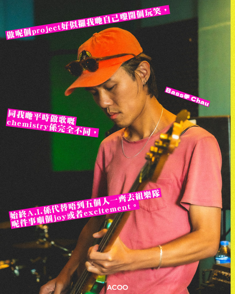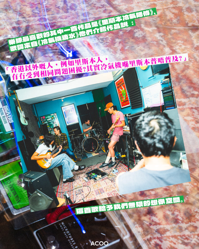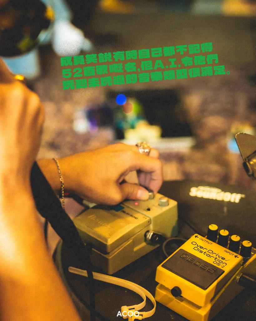 這種「錯」正正是這52首歌令人聽到會發笑之處。我記得首次在Clockenflap聽到的《冷氣機滴水》,跟住不停唱個「滴」字唱到想打爆幅牆,歌詞用了在《吉卜賽的冷氣機》、《夏灣拿之夜》和《街坊的投訴》,現在都戾氣全無,甚至聽着聽着會出現邀約樓上鄰居一起去效外野餐的畫面。Jon認為這貫徹了樂隊的風格:「我哋好多歌都係咁,其實唔係特登,但係我哋鐘意玩嗰個contrast,即係嗰個曲風是是很流行、好悅耳,而裡面就要藏一啲嘢。」Chau補充:「例如個歌詞係好angry嘅,點解你唔可以用soft點的方法去表達。」正如用《雞蟲狗公鴨》詞造的《青年大使2024》或者《Indie師兄》的詞生成的《自己檢討夏》,只聽音樂你真的會覺得可以成為以前某台暑假正直青年show的主題曲。