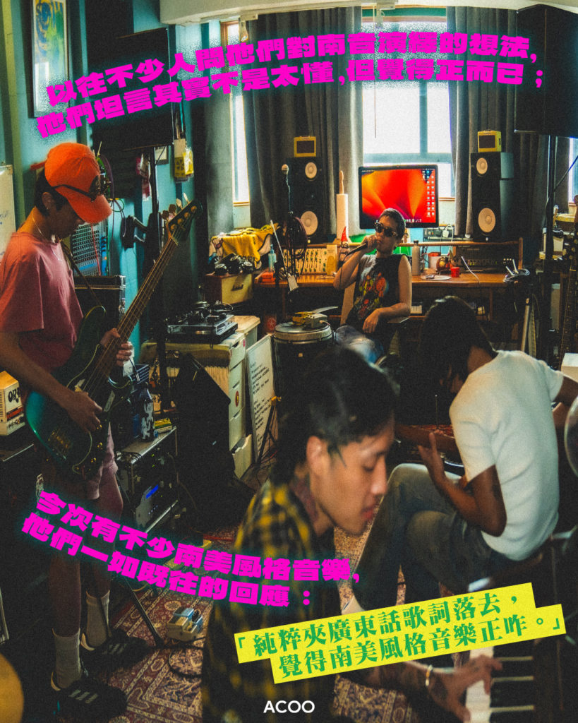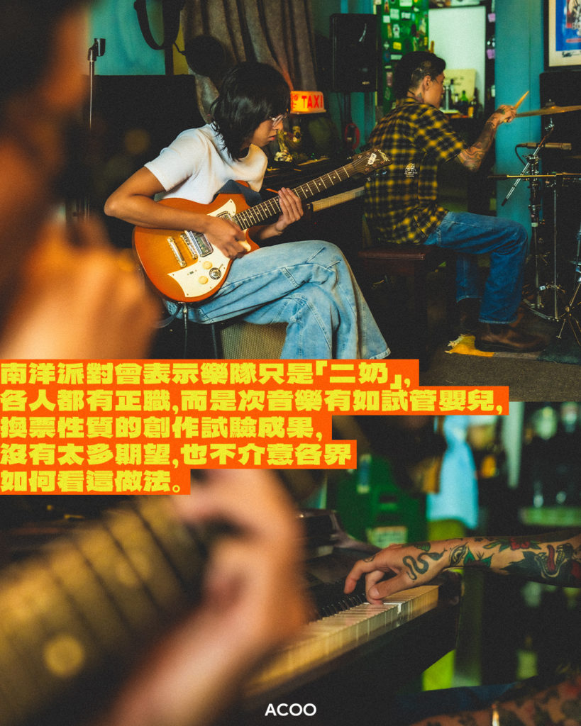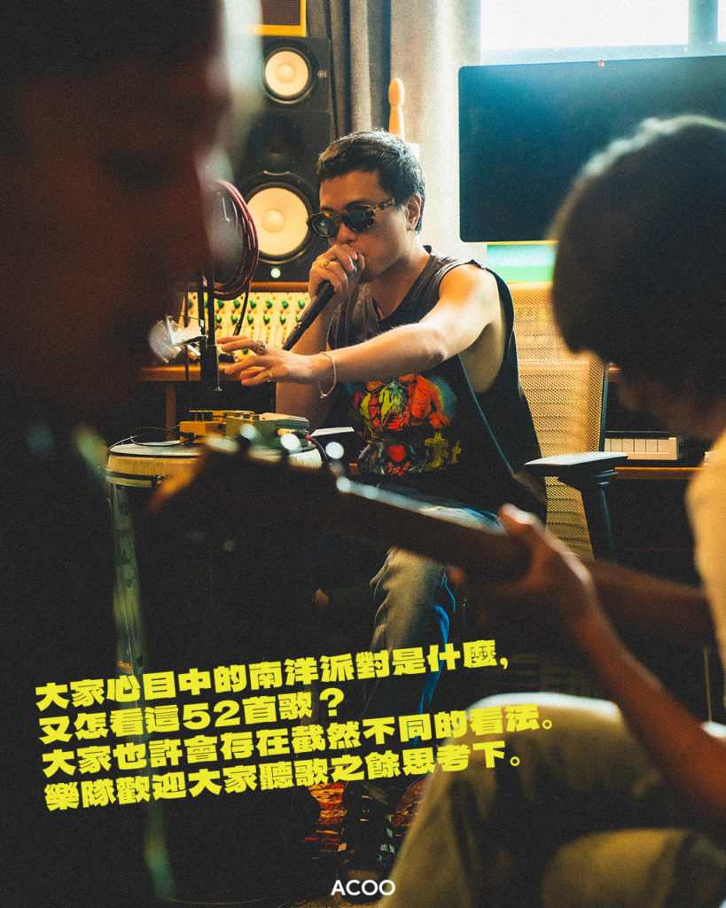 Covid 期間不少本地小型樂隊橫空出世,其中令人眼前一亮的是一玩post punk的南洋派對。聽過南洋派對的音樂的話,相信都會對主音演繹寫實歌詞的唱腔有深刻印象,令聽眾/觀眾認得自己是不少樂隊和音樂人夢寐魂求的目標,南洋派對無疑在這方面絕對做得很出色。有趣的是,是次推出52首作品都不再會聽到這種風格的演繹,玩到放棄自己signature會否玩得太大?眾人異口同聲地說沒有,主音Jon一臉不在乎:「我哋唔care呢樣嘢咖喎」,他反而認為除了因為歌詞大家會認出他們之外,另一個更大的作品特點是:「我地最戇鳩咖嘛。」他們在乎的,由始至終都是要好玩。