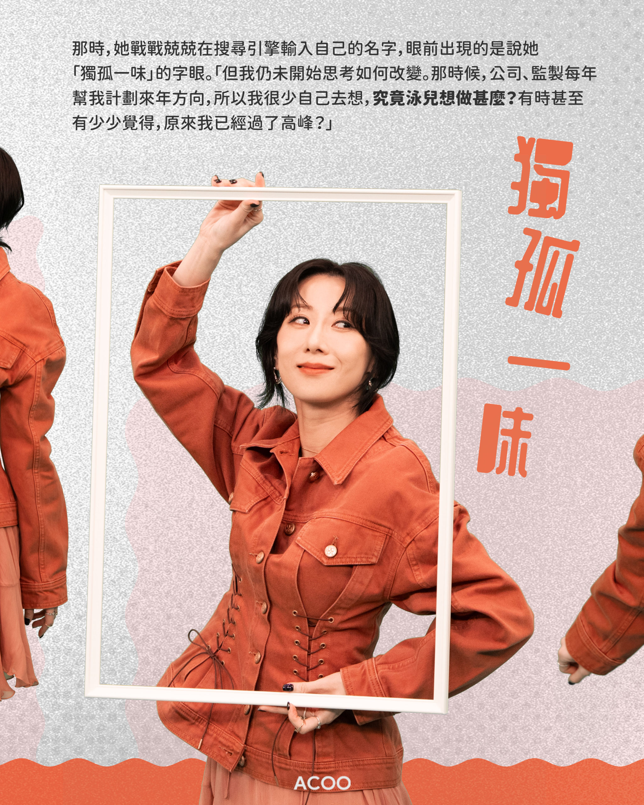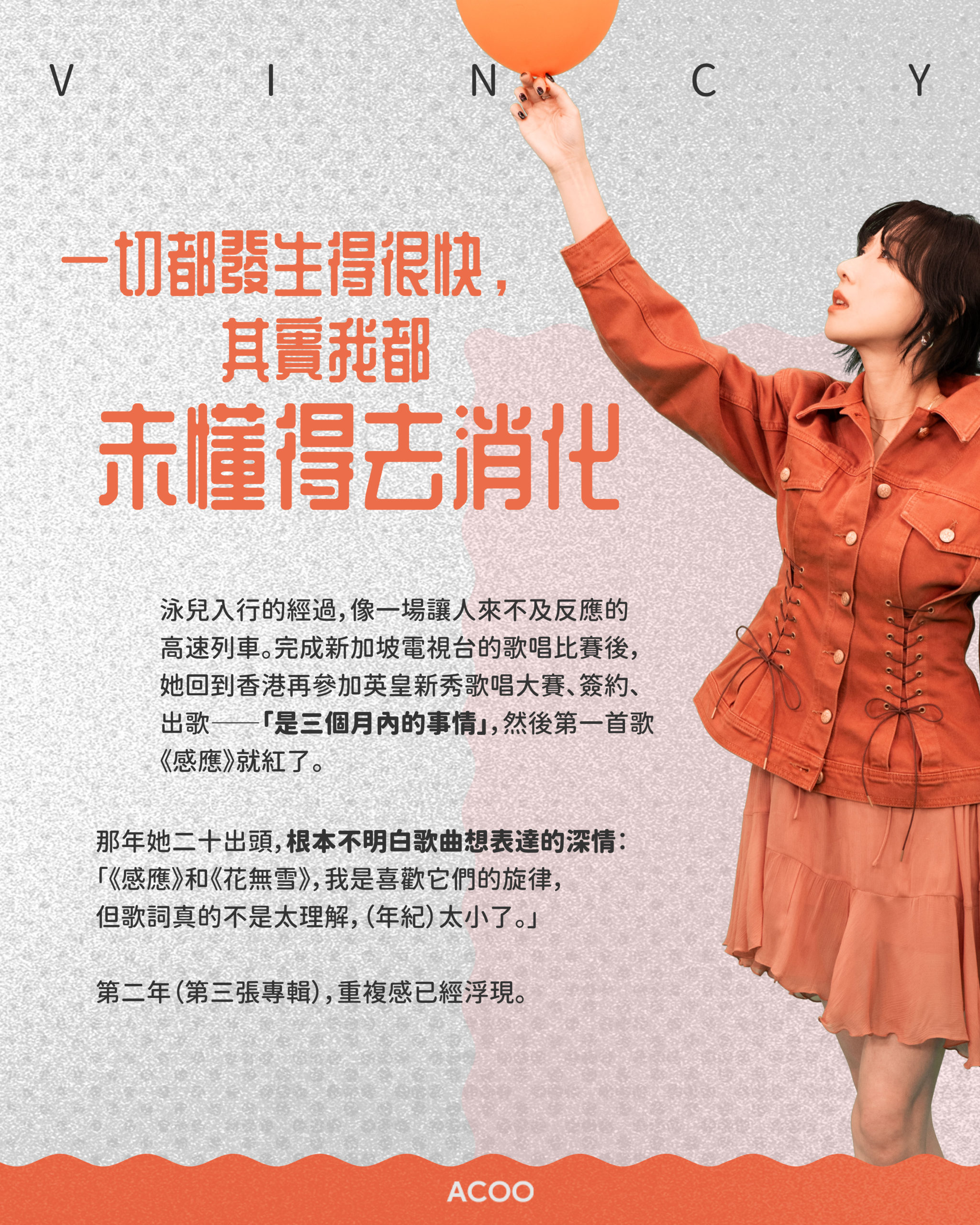 在訪問前兩日的簽唱會上,發生了這樣的一幕:Kiri T正在和歌迷們玩猜歌名遊戲,但她在台上看著題目,腦袋卻一片空白,緊張得手忙腳亂,最後竟然連自己作品的名字都忘了。事後回想,她忍不住自嘲:「明明係好簡單嘅嘢,但我好似好Kam咁⋯⋯大家話『嘩,你記性,真~係好差喎』。我都話,我可能要食啲合桃補腦⋯⋯」 如果這種尷尬與焦慮是你曾有過的共鳴,那麼她即將在澳門舉辦的演唱會《Hello Introvert》,或許就是為你而設的一個「安全出口」。在這個演唱會,她邀請各位「I」人可以放心自己一個前來,被音樂治癒:「例如我都係一個唔擅於表達自己嘅人,或者有好多嘢唔敢講。但我希望呢個演唱會可以話畀大家聽——即使我哋性格咁迴避,但我哋都值得被了解、能夠被了解。」 「我依家都會embrace自己咁Kam。」Kiri T笑說。 採訪:Heidi @heidi.is.strong 攝影:Andrew @andrew_bangchan 設計:Larry @ialyrral_ |不需要「被迫營業」的安全空間 對於很多 I 人來說,看演唱會往往伴隨著一種無形的壓力——害怕被要求站起來跳舞、害怕要表現得 High、害怕要一同高聲歌唱。「Hello Introvert」,是一個讓「I」人感到安全、舒適、自在的空間:「呢度唔會有好多機關或者娛樂,唔會叫大家要好雀躍起身。我會形容係好chill,想講嘢就講嘢,想唱歌就唱歌嘅形式。」 Kiri T這樣解讀「I」這回事:「其實I人都想要connection,只不過我哋嘅friendship要好exclusive,好gentle。我哋都鍾意好近,但可能係好近、輕輕咁講安慰你嘅說話。」這次,她希望在澳門百老匯舞台創造一個「Safe Space」,並正在探索各種適合內向者的「距離」。她又透露在歌曲選擇上希望營造一些「contrast」:「例如大家以為呢隻歌要好大力,其實可以好細力?或者以為呢隻歌好細力,其實原來可以好大力?因為對我嚟講,大家可能會誤會I人好冷漠,但可能我哋心底有好多嘢想講,只係怕打擾人哋。所以我都好想探索一下contrast呢個主題。」 |和自己的「I」來一場和解 「大概幾年前,我成日會同朋友講,如果我E啲就好啦。因為每次上台都覺得好吃力,每次訪問都會好甩咳。以前我做音樂節目,我知道見到唔識嘅人,我會預早3、4個鐘冷靜,聽meditation嘅歌,『咚~』嗰啲。」 舊作《icouldusealittlehelp》裡的一句歌詞:「Why do I pretend again and again, that I'm stronger than I am?(為何我一再假裝自己比想像中強悍?)」,正正道出她從前漫長的自我拉扯。 這幾年香港人對 MBTI 、「I」與「E」的討論多了,社會也開始對「I」多了一份理解,「某程度上時代都幫咗我。」再後來,她發現自己的聽眾都與自己面對同一種困境:「佢哋都會話喺社會好大壓力,唔夠E。反而因為我企出嚟就係咁Kam,好多歌迷會同我分享,原來我啲歌會令佢哋覺得被了解,咁我都覺得呢件事好療癒。」 早些日子派台的《我可能是迴避型》,講的正是害怕踏前一步的這種情緒。若然因為自己掙扎或卻步,而錯過一些機會甚至一些關係,不會很可惜嗎?Kiri T則這樣認為:「如果因為你I而錯過一啲關係,可能呢個都未必係你想要嘅關係。」最重要的,是認清自己想要的是甚麼。 所以,Kiri T希望這場《Hello Introvert》演唱會,不只是一場演出,更像是一次「同類」的聚會。「我覺得唔需要有壓力去invite人、約人一齊。因為你哋已經約咗我,我已經約咗你哋啦!I’ll see you there!」 Makeup: @tammyau_makeup Hair: @jamieleehair @issac_lo @hola.hair.pets In ACOO, you