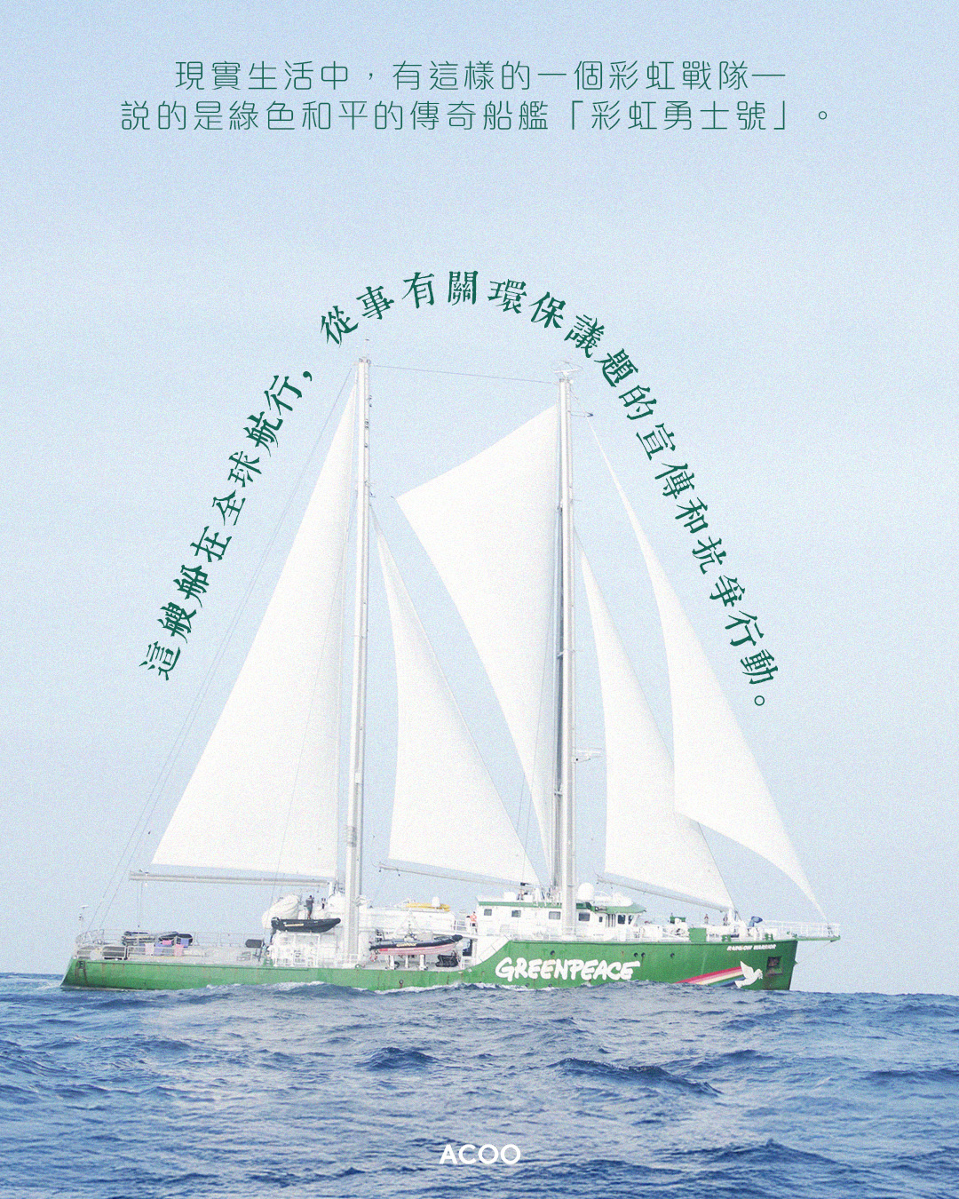 小時候下課看動漫片,總會有這麼一齣「戰士」片:怪獸侵襲地球,五個被選中的平凡人變身成五星戰隊,集結眾人力量,擊敗怪獸,維護地球和平;現實生活中,也有這樣的一個彩虹戰隊——說的是綠色和平的傳奇船艦「彩虹勇士號」。這艘船在全球航行,從事有關環保議題的宣傳和抗爭行動。