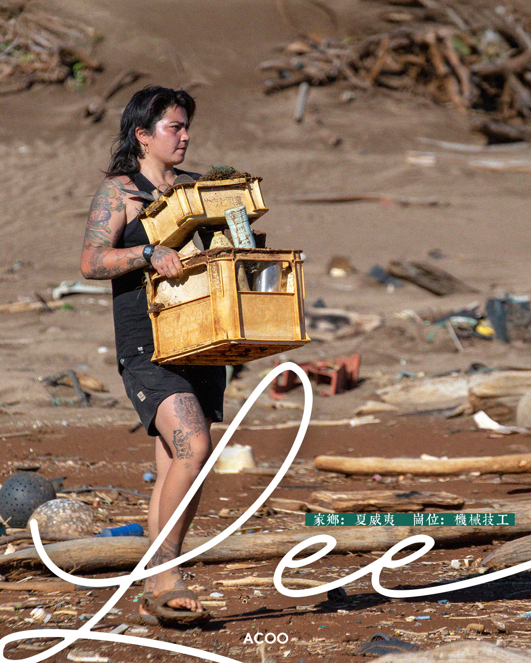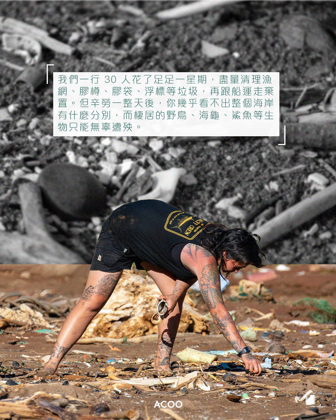 2018年,Lee跟隨綠色和平,前往夏威夷一個無人小島「Kaho’olawe」進行淨灘審計。讓人震驚的是,這片土地深受塑膠污染殘害,導致珊瑚退化、貝殼與魚類逐漸消逝,美麗的海洋取而代之只剩塑膠垃圾飄浮。「我們一行 30 人花了足足一星期,盡量清理漁網、膠樽、膠袋、浮標等垃圾,再跟船運走棄置。但辛勞一整天後,你幾乎看不出整個海岸有什麼分別,而棲居的野鳥、海龜、鯊魚等生物只能無辜遭殃。」