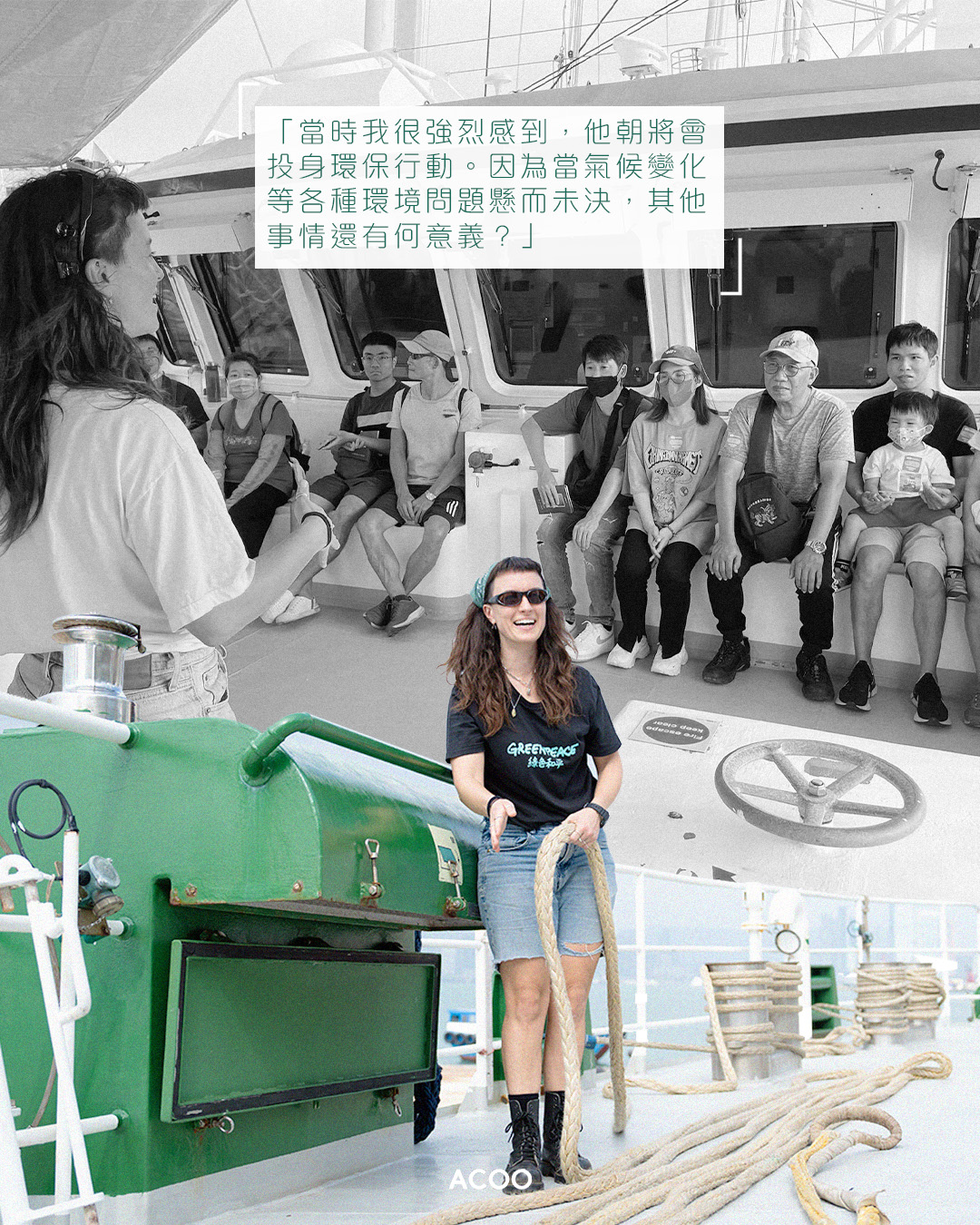這一個月以來,最讓Hannah難忘的,是從香港到高雄期間接連遭遇三個颱風吹襲,使船程不斷延誤,連甲板欄杆也幾乎被吹走:「我在每一站均遇見很出色的人們,每一位都是熱心關注環保、在本土挺身行動的同行者,令我獲益良多。」