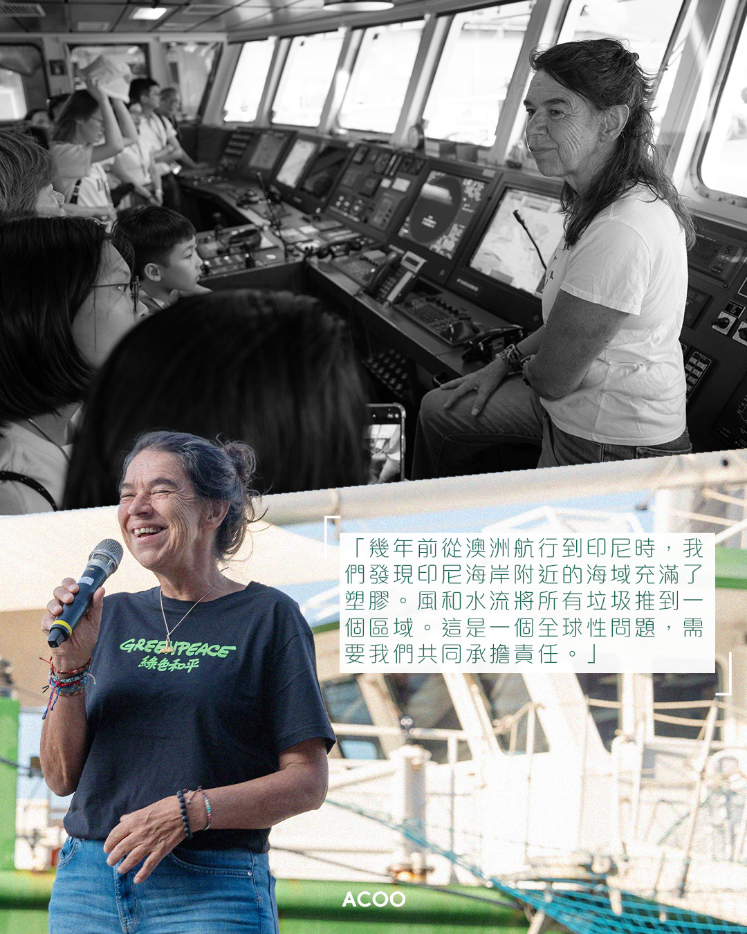 不過,與此同時,在綠色和平工作的 25 年裡,Hettie 見證了海上塑膠污染的問題日益加劇:「幾年前從澳洲航行到印尼時,我們發現印尼海岸附近的海域充滿了塑膠。風和水流將所有垃圾推到一個區域。這是一個全球性問題,需要我們共同承擔責任。」