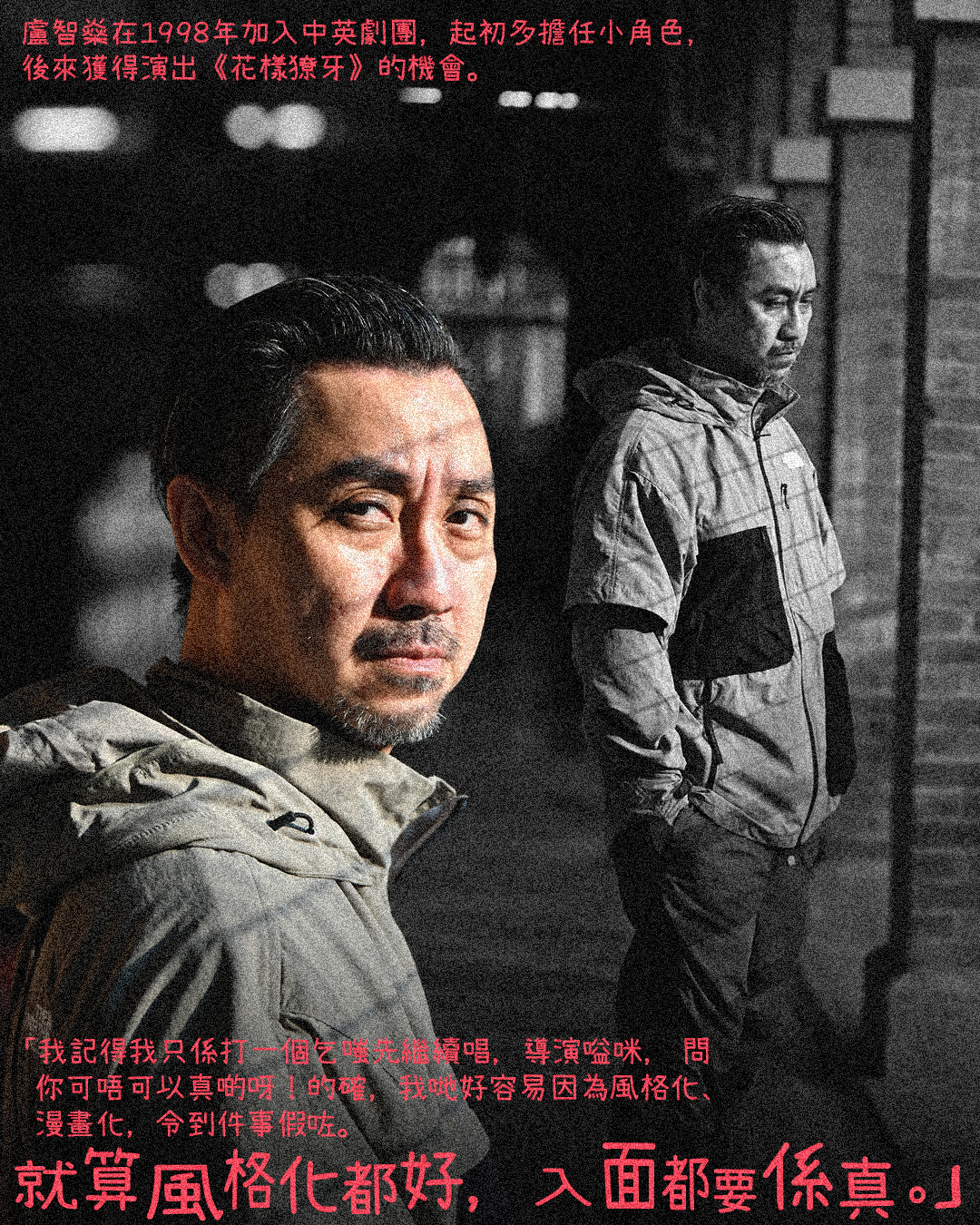 角色的癲喪與過度浮誇,可能只是一線之差。的確,盧智燊當年亦陷入了「風格化」的漩渦。「我記得我只係打一個乞嗤先繼續唱,導演嗌咪,問你可唔可以真啲呀!的確,我哋好容易因為風格化、漫畫化,令到件事假咗。就算風格化都好,入面都要係真。」