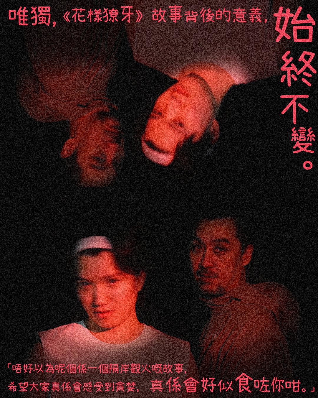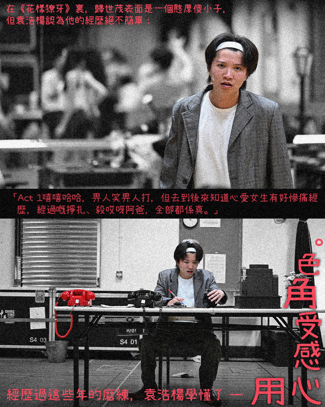 在《花樣獠牙》裏,歸世茂表面是一個憨厚傻小子,但袁浩楊認為他的經歷絕不簡單:「Act 1嘻嘻哈哈,畀人笑畀人打,但去到後來知道心愛女生有好慘痛經歷,經過嘅掙扎、殺哎呀阿爸,全部都係真。」經歷過這些年的磨練,袁浩楊學懂了——用心感受角色,又刻意阻止自己重看20年前演出片段,「怕畫面停留喺自己腦海,局限自己,停止自己探索。」