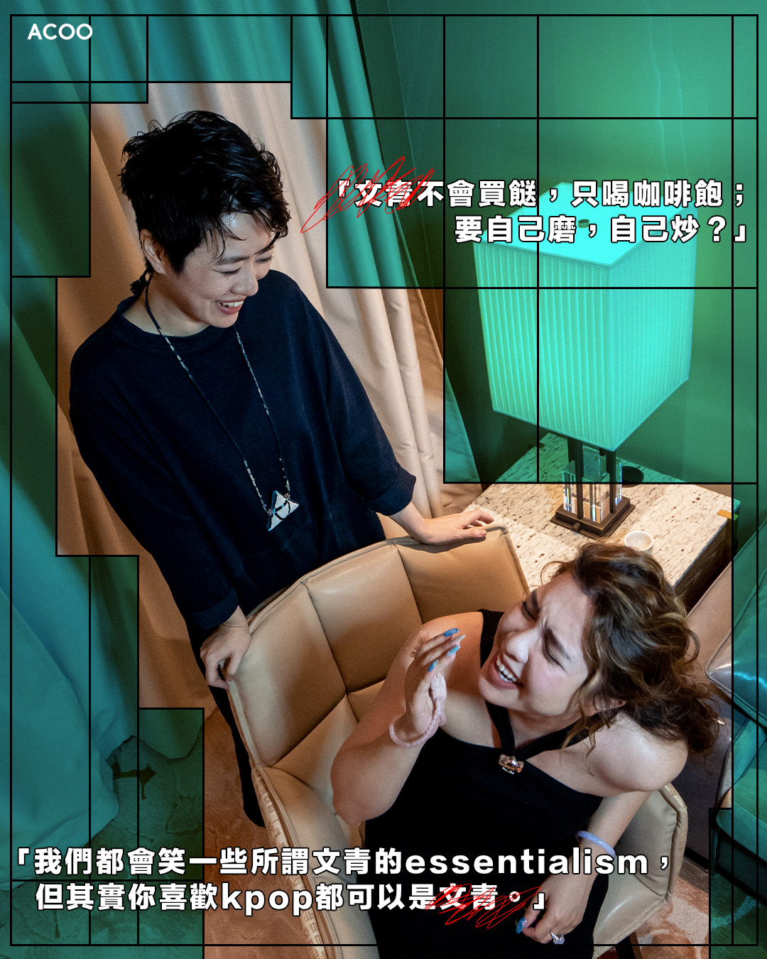 Serrini續說,「在台灣你不會individually找到一個人叫文青;在香港你不會因為看了一個導演的戲,你就會稱自己很有Taste。」而有些人或者正正就是因為「無文化」,才會強調自己是如此的「有文化」。她們認為「文青」並不能夠被如此歸類,亦不可以快速地用一個詞了解大家,「我們都會笑一些所謂文青的essentialism,但其實你喜歡kpop都可以是文青。」Serrini說。同樣地,她們二人也不是如此容易就能被界定。「如果你要search,你要google,或者你要搜尋、索引完全不認識的東西,你要找一個索引,這樣是很有用的,但就會永遠停留在『searching』。」Serrini認為,若僅透過「標籤」去了解別人,那麼所有的理解都只會繼續流於表面。她舉例,不少人或會覺得她「好dramatic」,「但其實我們都偏靜。」。Serrini表示,很多唱作人,台上與台下其實分別頗大,但正正就是因為在舞台上,她有屬於自己的comfort zone,和聽眾有着最遠的距離,所以她才能夠不理別人的目光,自在、放心地展現自己,成為觀眾眼中外放的「Serrini」。