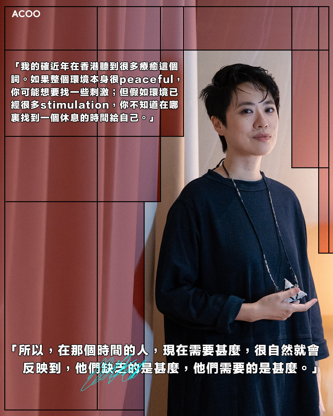 標籤除了會對人設限之外,亦限制了人們對作品的想像。同樣是唱作人的Serrini和Yoyo,縱然寫出了很多不同類型的音樂作品,但歌曲往往都會被冠上「療癒」的標籤。「我的確近年在香港聽到很多療癒這個詞。如果整個環境本身很peaceful,你可能想要找一些刺激;但假如環境已經很多stimulation,你不知道在哪裏找到一個休息的時間給自己。所以,在那個時間的人,現在需要甚麼,很自然就會反映到,他們缺乏的是甚麼,他們需要的是甚麼。」Yoyo解釋。