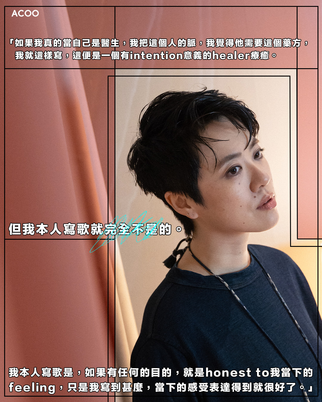 至於如果說,她的創作是要療癒為目的?她的答案同樣是否定的,「如果我真的當自己是醫生,我把這個人的脈,我覺得他需要這個藥方,我就這樣寫,這便是一個有intention的healer但我本人不是的,我本人寫歌是,如果有任何的目的,就是honest to我當下的feeling,表達得到就很好了。」