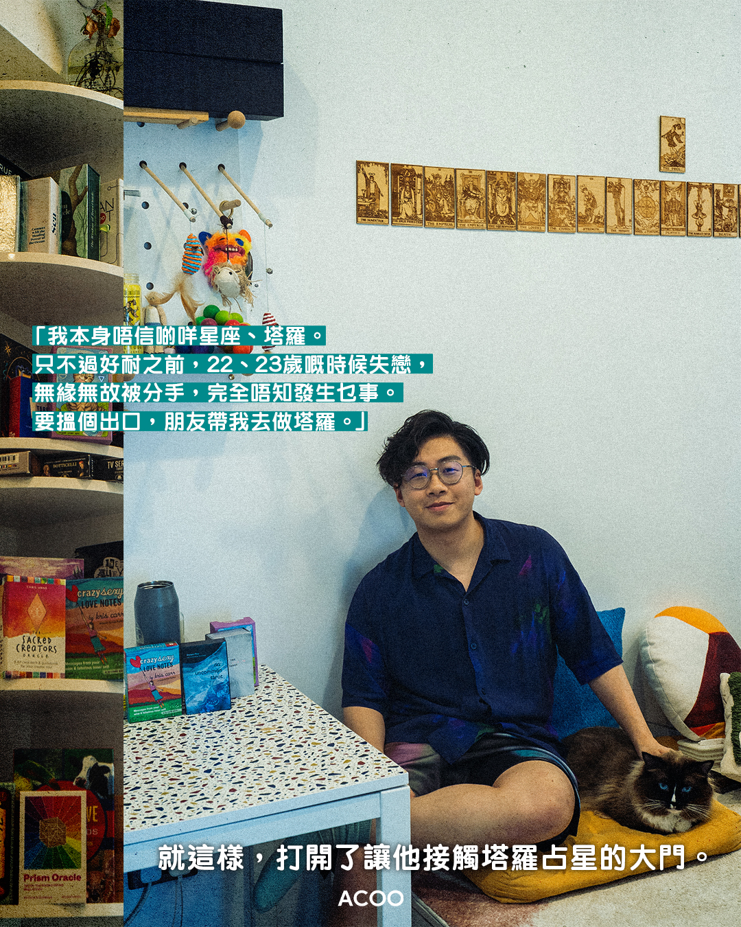在大台的電視劇,但凡有占卜塔羅的角色,總會是一個被冠以「神婆」稱號,披著黑色頭紗巾的長卷髮女生,在一個黑漆漆的房間看着桌前的水晶球,雙手凌空「作法」。然而,90後的塔羅師棍兄正是想塔羅「通俗啲、貼地啲」。