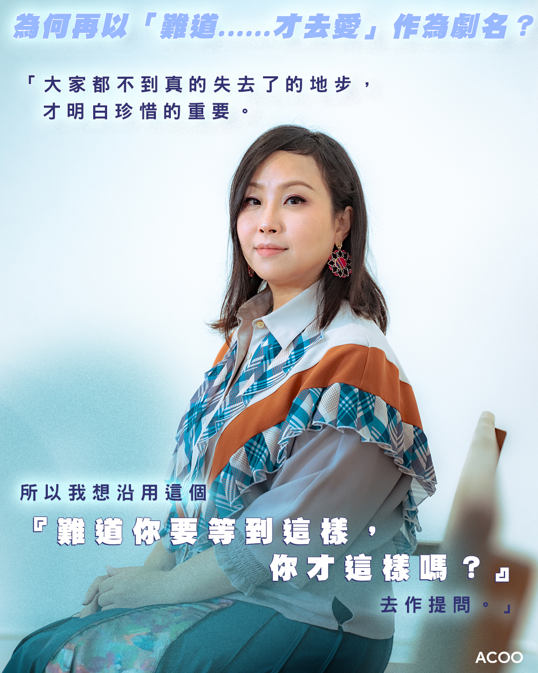 這次蝦頭再次挑戰獨腳戲 X stand-up comedy的形式,一人分飾多角,呈現現今時代的戀愛。被問到為何再以「難道⋯⋯才去愛」作為劇名,她解釋:「大家都不到真的失去了的地步,才明白珍惜的重要。所以我想沿用這個『難道你要等到這樣,你才這樣嗎?』去作提問。」蝦頭說,自己都是「未被逼到牆角都不肯面對」的人,所以這次也是一場對自己的提醒。