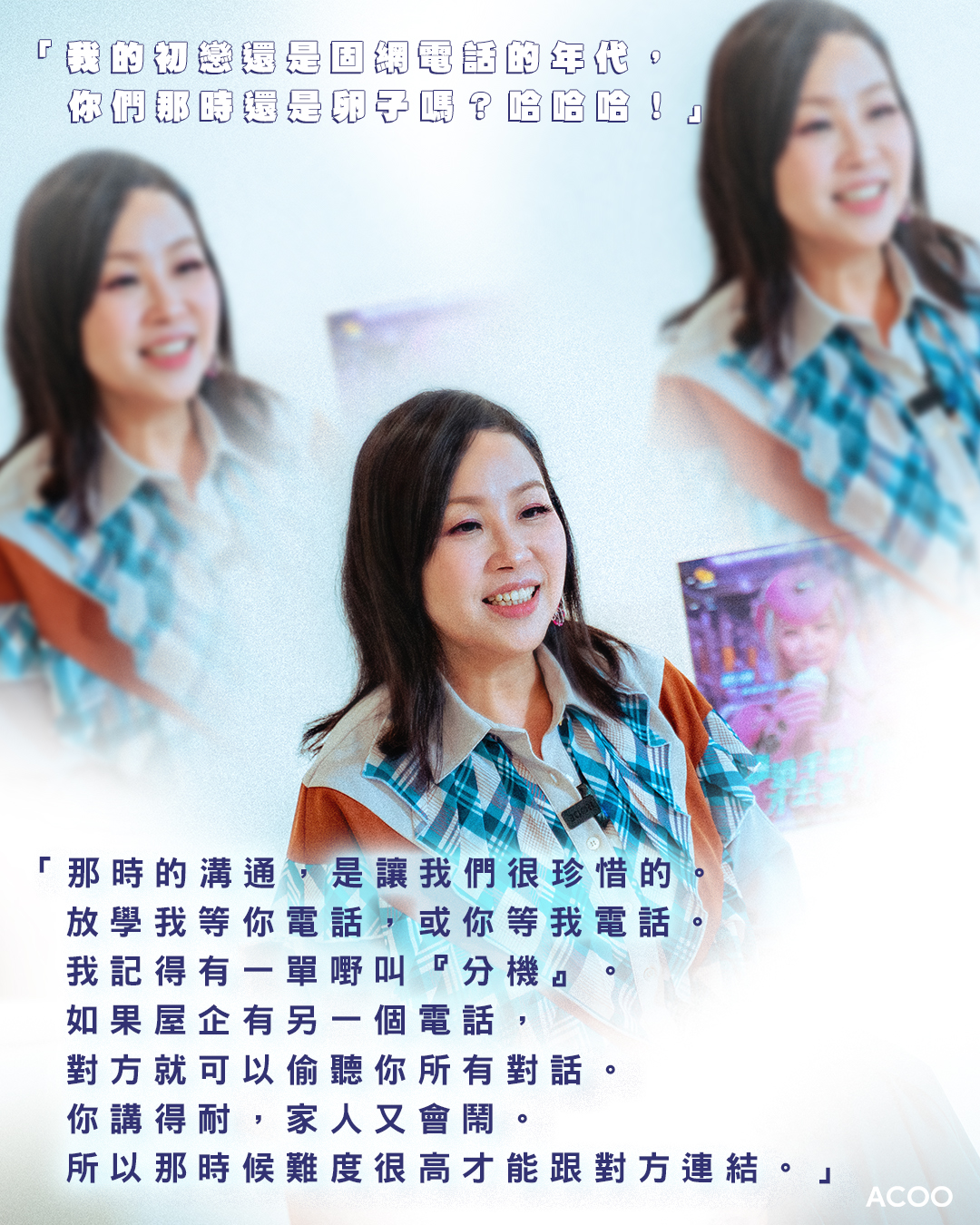 蝦頭的初戀,未有WhatsApp、IG、甚至未有SMS,她朗聲大笑:「我的初戀還是固網電話的年代,你們那時還是卵子嗎?哈哈哈!」