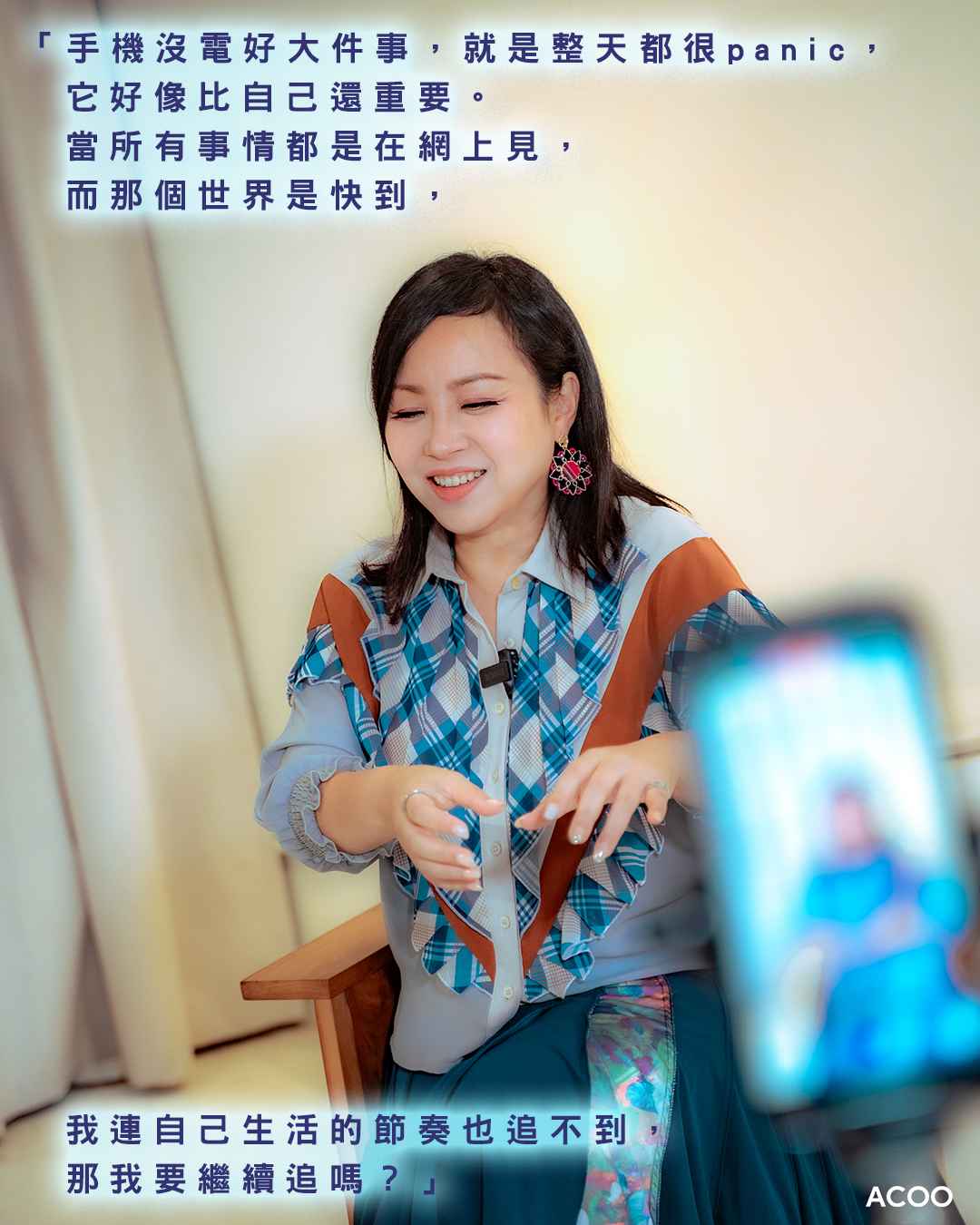 而到了現在,社交媒體的快速、方便讓人上癮。在網絡世界彷彿做甚麼都可以,再遠的人都伸手可及。蝦頭也曾經成為電子上癮的人,「手機沒電好大件事,就是整天都很panic,即是,它好像比自己還重要。當所有事情都是在網上見,而那個世界是快到,我自己生活的節奏也追不到,那我要繼續追嗎?但我又做這行,其實也要追。但不是呀,我又真的不想,那怎麼辦?我經歷過很多這些過程。」